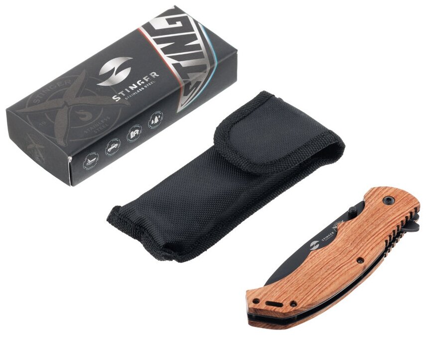 Нож складной Stinger, клинок чёрного цвета 90 мм, рукоять из дерева и стали коричневого цвета, в нейлоновом чехле FK-1116RO интересное: