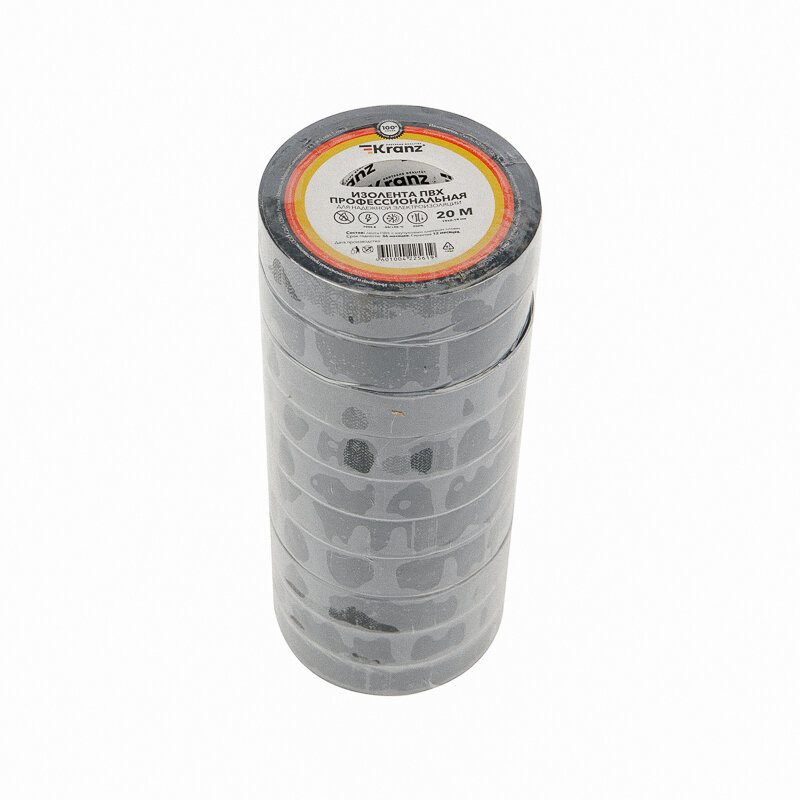 Профессиональная изолента ПВХ KRANZ 0,18х19 мм, 20 м, серая KR-09-2808