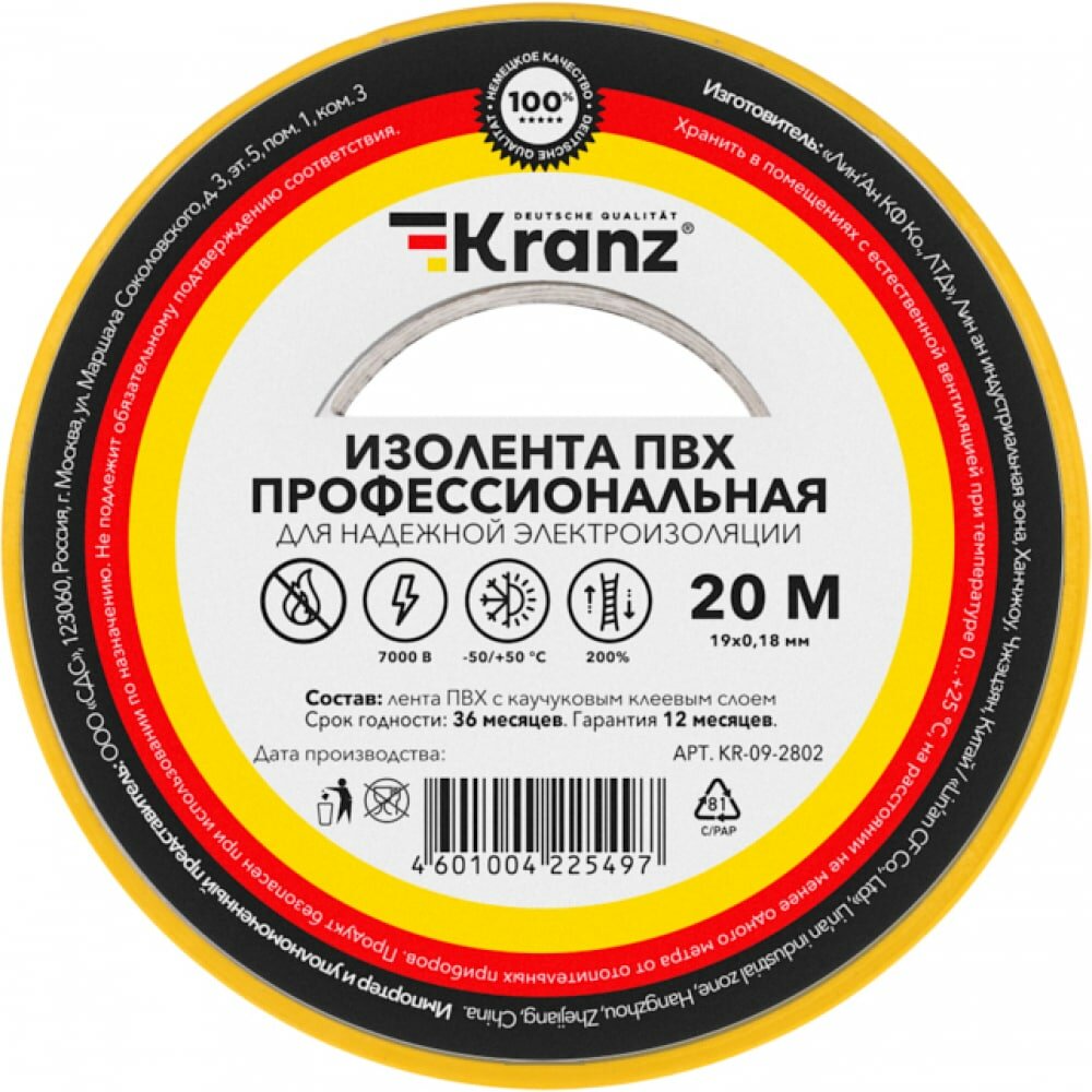 Изолента жёлтая ПВХ профессиональная KRANZ, 0.18х19 мм, 20 м, (от -50С до +50С) 2шт/упак.