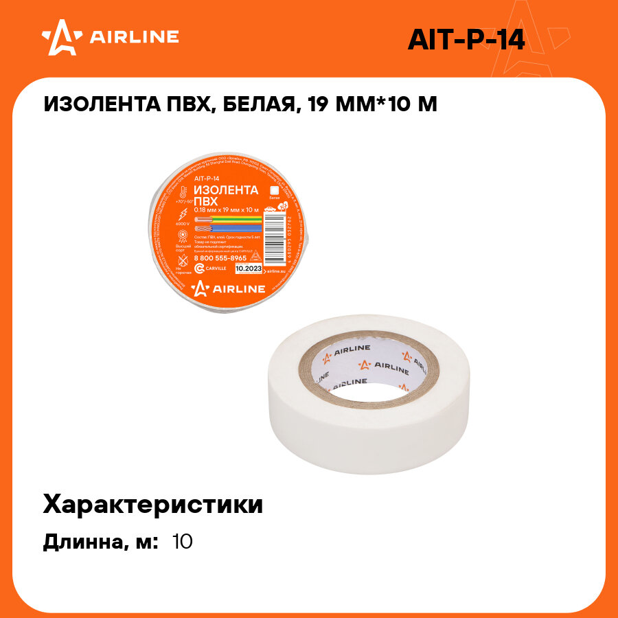 Изолента ПВХ, белая, 19 мм*10 м (AIT-P-14), Airline, 1 шт
