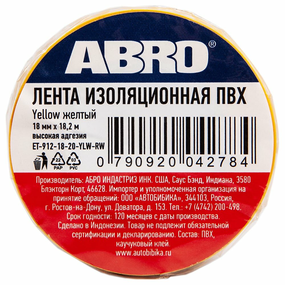 Изолента ABRO ET-912-18-20-YLW-RW интересное: