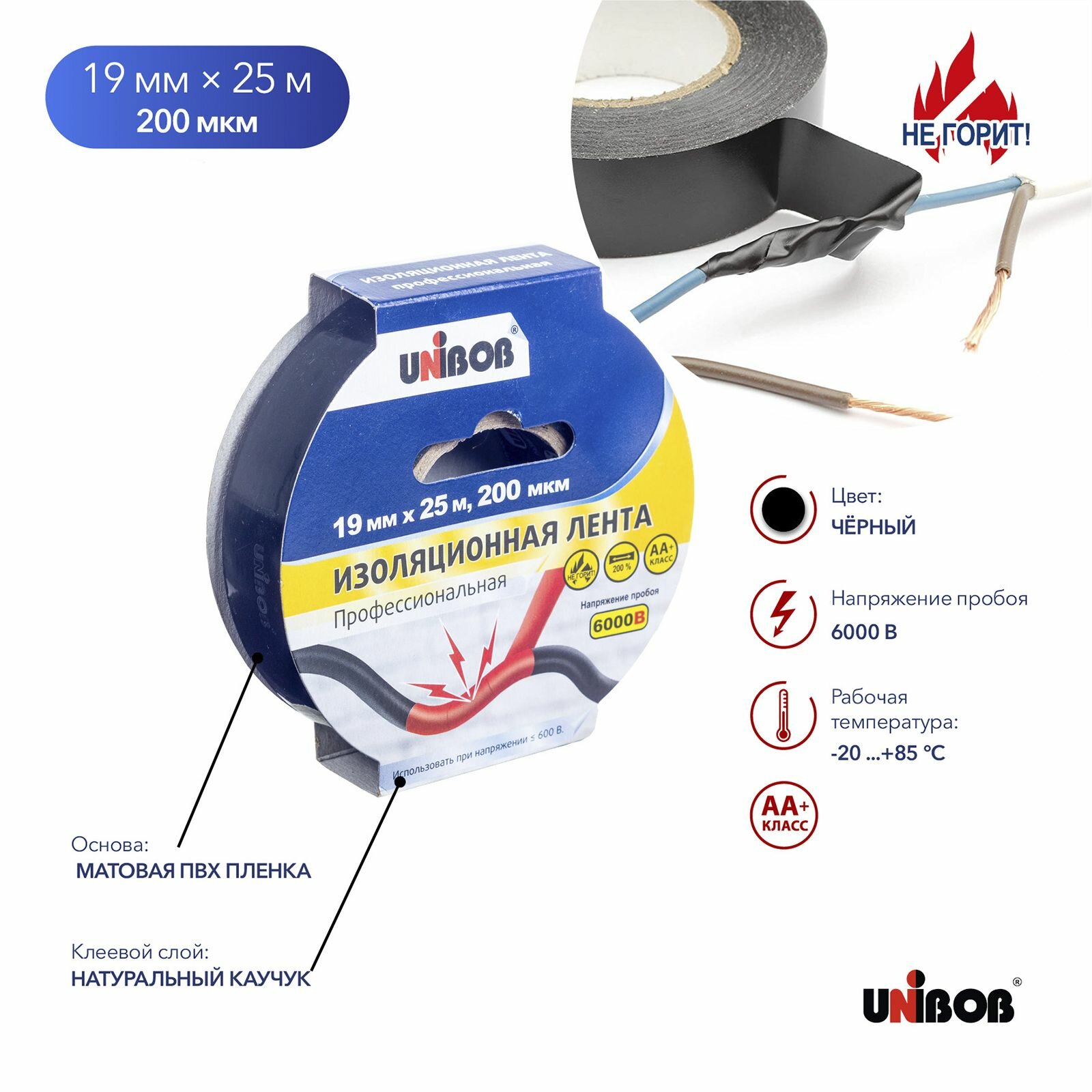 Профессиональная изолента, черная, 200 мкм, 19 мм x 25 м Unibob