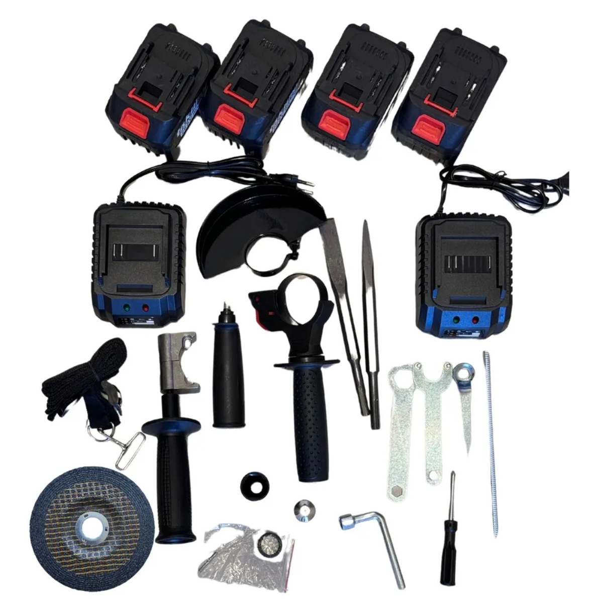 | Состав (подробно) | 4 аккумулятора 2 зарядных устройства аккумуляторная ушм, бесщеточный шуруповерт, сучкорез,гайковерт, торцевая пила |