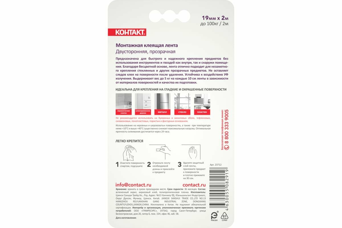 Контакт Монтажная клеящая лента двусторонняя 19мм х 2м 23712