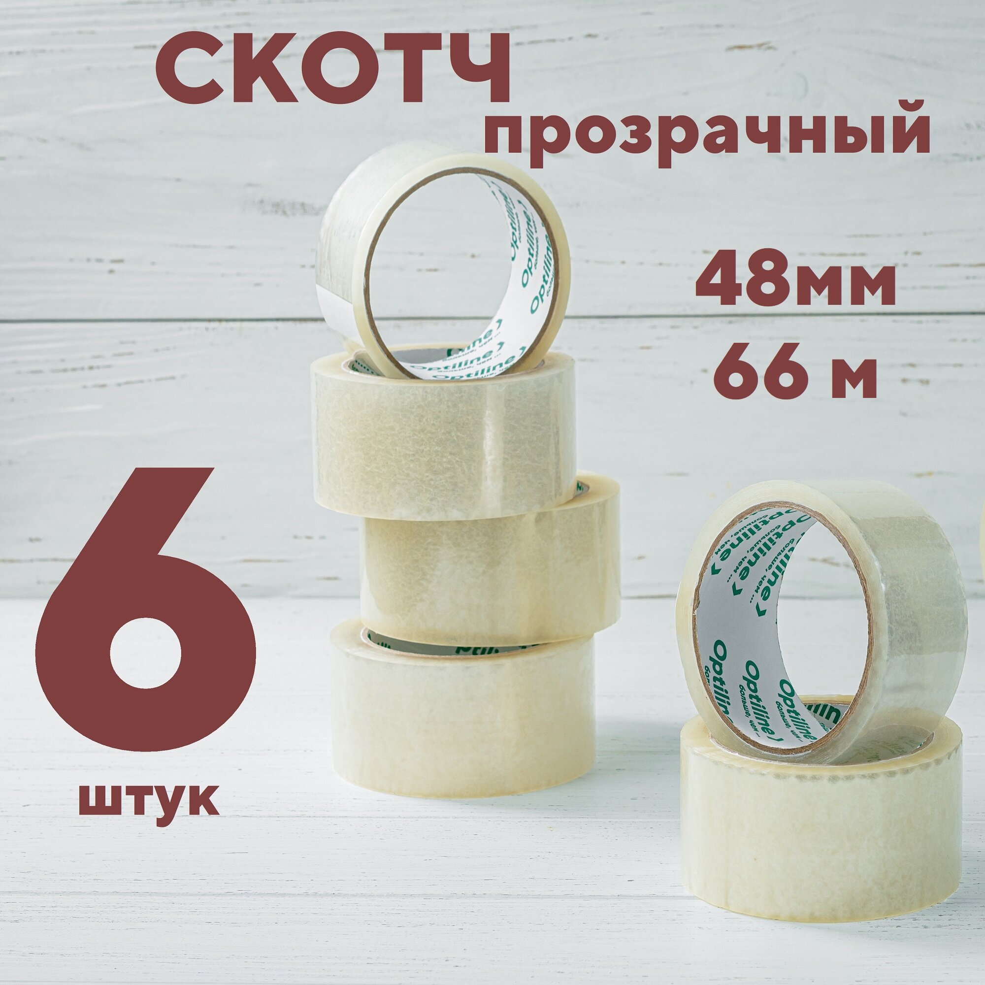 Скотч прозрачный широкий 48 мм, 66 м, 6 рулонов