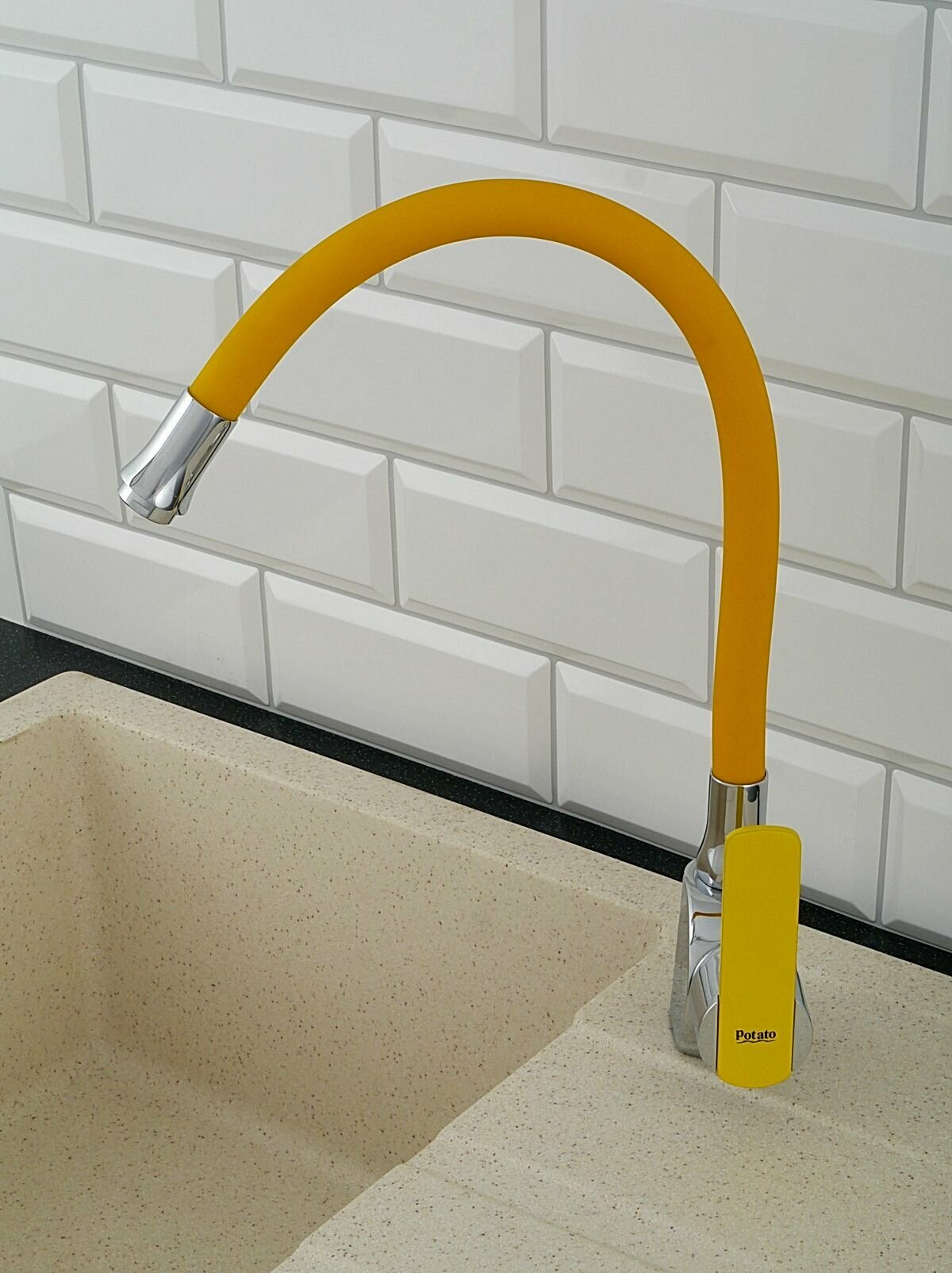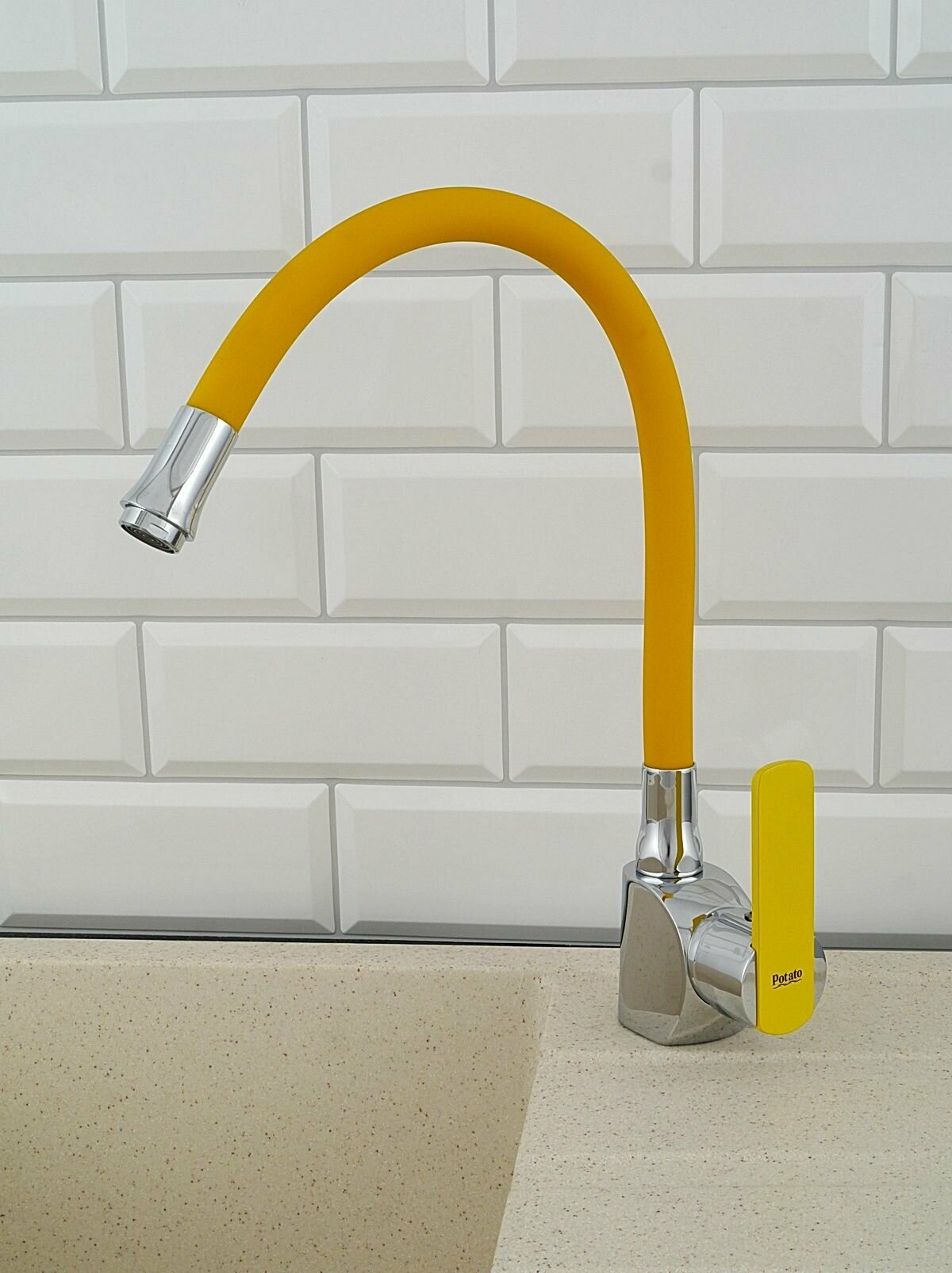 СохранитьСмеситель на кухню Potato P58238-10 с гибким жёлтым изливом, картридж 35 мм, хром, крепление гайка интересное: