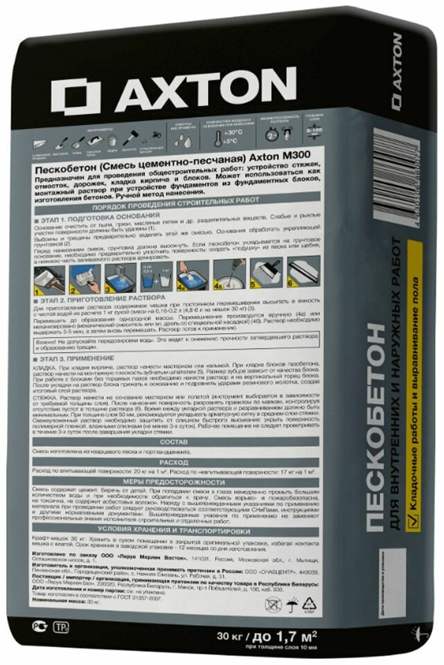 Ниже Вы можете прочитать отзывы на Акстон пескобетон М-300 (30кг) / AXTON смесь пескобетон М-300 (30кг), ознакомится с подробными характеристиками, посмотреть интересные обзоры и фотографии на Акстон пескобетон М-300 (30кг) / AXTON смесь пескобетон М-300 (30кг).