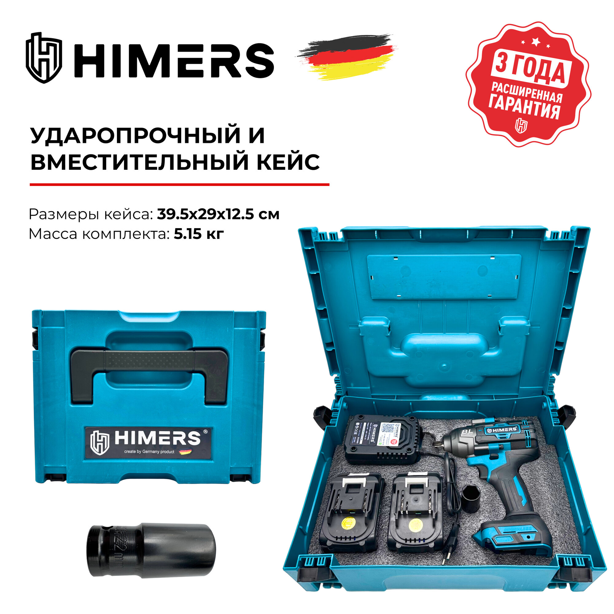 55 Н.М. Угловой гайковерт ударный HIMERS DMT55B аккумуляторный 18V, 2 АКБ по 3 А.ч., 5 Н.м., / Кейс / для закручивания, 18в, квадрат 3/8, 11 головок