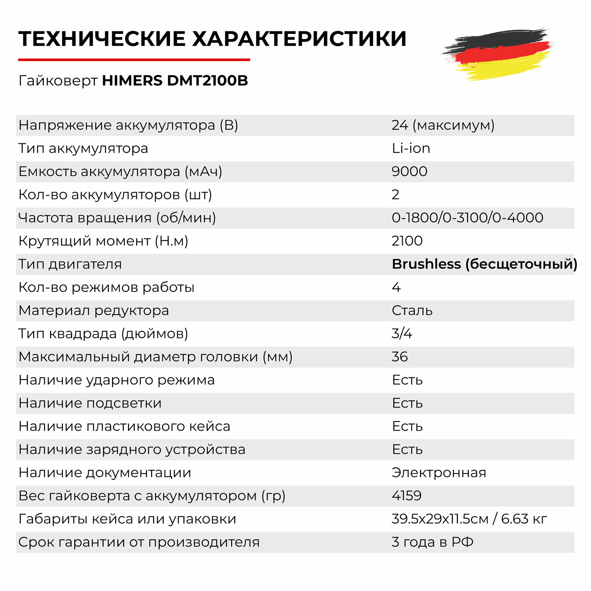 890 Н.М. Ударный бесщеточный гайковерт HIMERS DMT890B аккумуляторный 24V, 2 АКБ по 6 А.ч., Кейс / для закручивания, 24в, квадрат 1/2