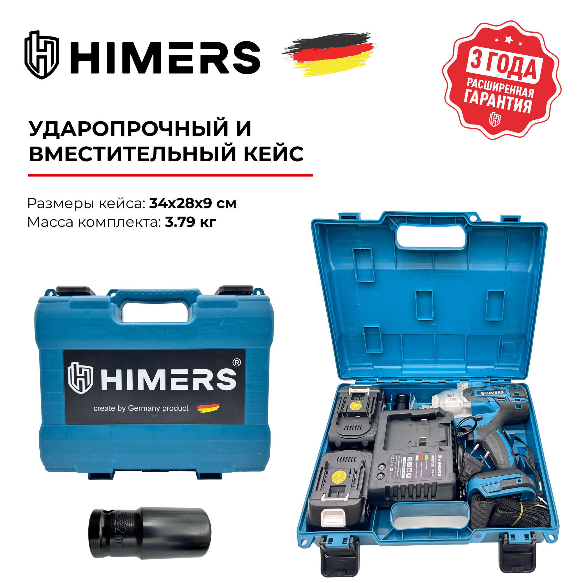 55 Н.М. Угловой гайковерт ударный HIMERS DMT55B аккумуляторный 18V, 2 АКБ по 3 А.ч., 5 Н.м., / Кейс / для закручивания, 18в, квадрат 3/8, 11 головок