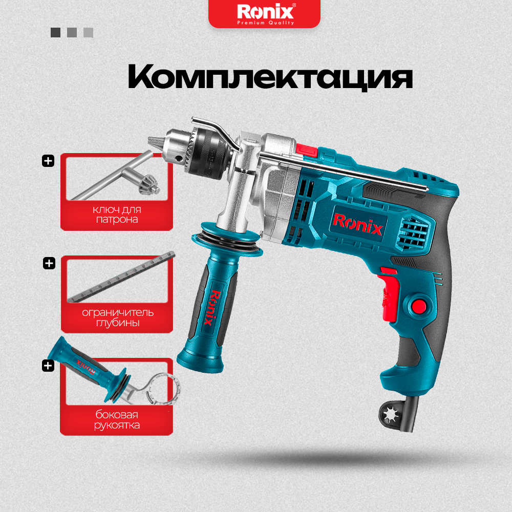 Ударная сетевая дрель Ronix мощностью 750Вт ключевой патрон, функция реверса, регулировка глубины сверления, дополнительная рукоять