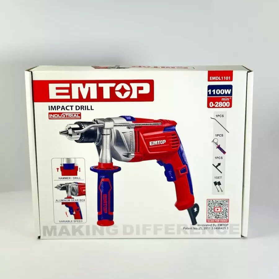 Электрическая ударная дрель 1100 Вт, (коробка) EMTOP шкала глубины сверления+дополнительная рукоять интересное:
