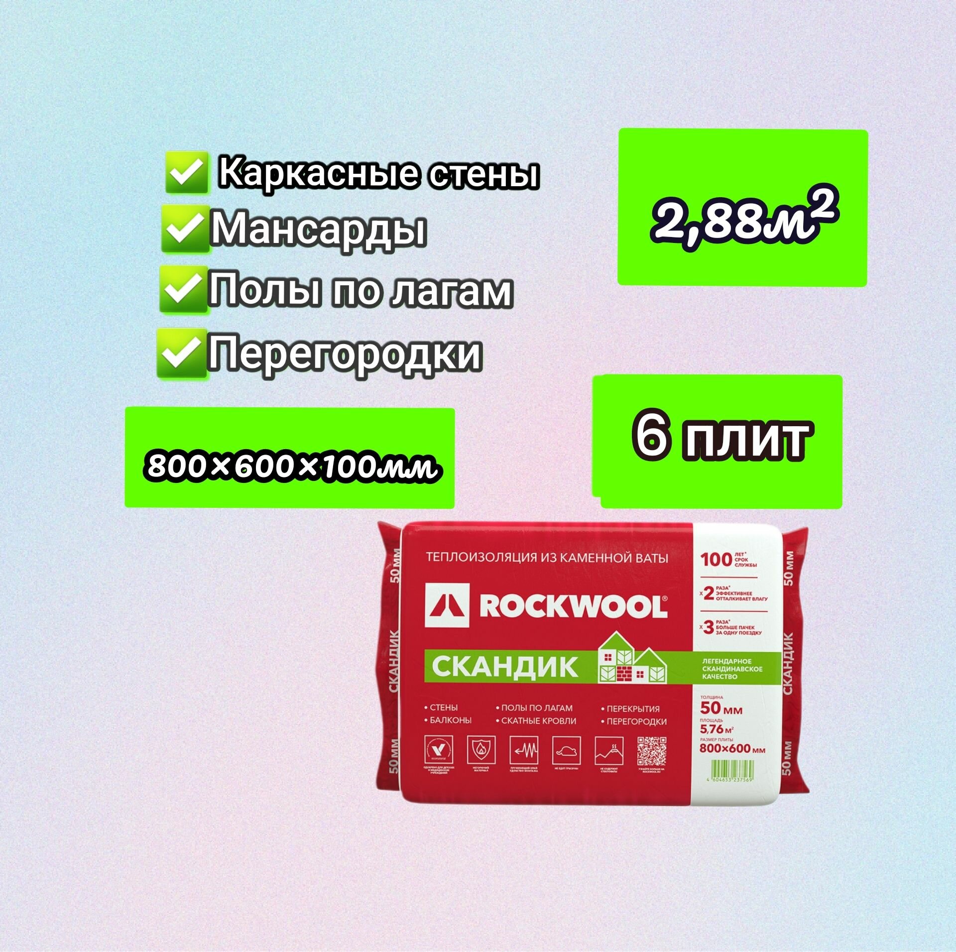 Каменная вата утеплитель Роквул Лайт Баттс Скандик 800х600х100мм, 144 плиты, 69,12 м2 / Утеплитель Rockwool