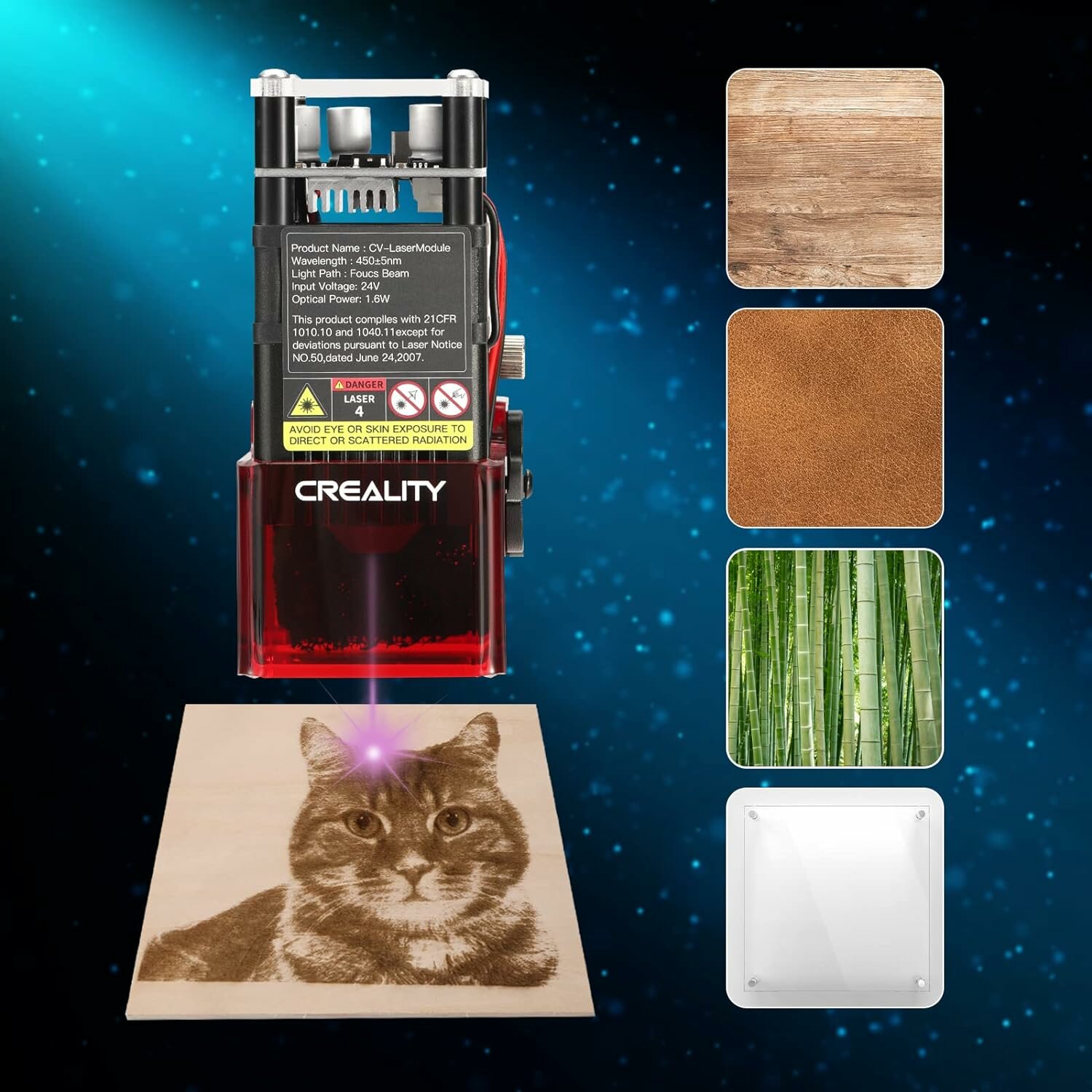 Модуль лазерного гравера для 3D-принтера Creality Ender 3 S1. Насадка для лазерной гравировки 1,6 Вт, 24 В, 450 нм, сине-фиолетовый свет, обновленная защитная крышка и фиксированный фокус, для Ender 3 S1, Ender 3 S1 Pro и Ender 3 S1 Plus. интересное: