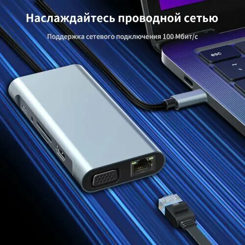 | Дополнительная информация | Подходит: MacBook, ASUS, Acer, Apple, Canon, Dell, Digma, Epson, Elari, Ark, BenQ, Gigabyte, Huawei, MSI, Samsung, Xiaomi. Тип интерфейса: USB Type-C Порты: 11 Стандарт: USB 3,0 Функция: HDMI-совместимый/кард-ридер/RJ45. Цвет: серый Материал: алюминиевый сплав Выходной интерфейс: USB2.0 * 3/USB3.0 * 1/RJ45 100mbps * 1/VGA * 1/4k HDMI-совместимый * 1/87W PD * 1/3.5 мм * 1/порт TF/порт SD |