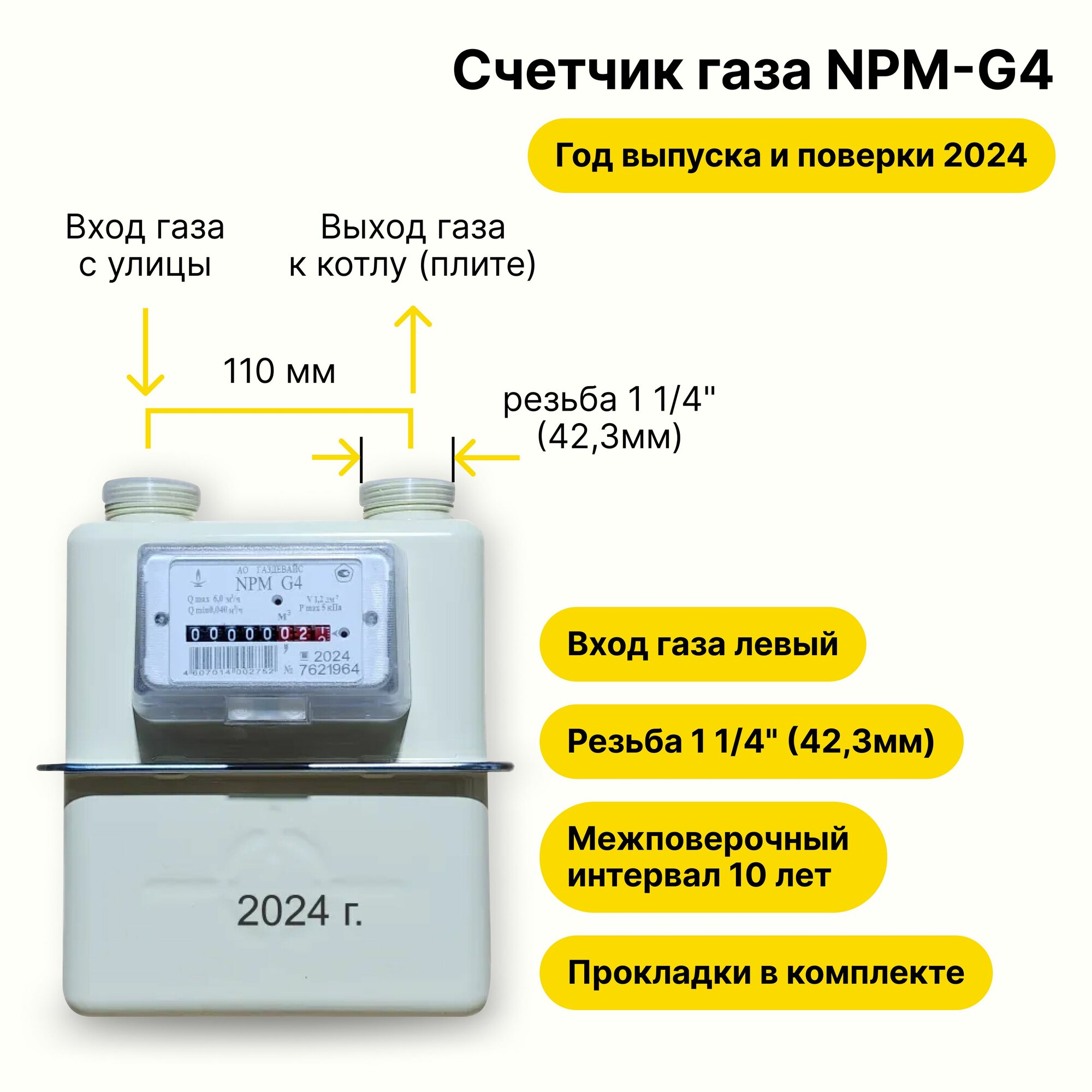 Счетчик газа NPM-G4 (вход газа левый -->, резьба 1 1/4", прокладки В комплекте) 2024 года выпуска и поверки интересное: