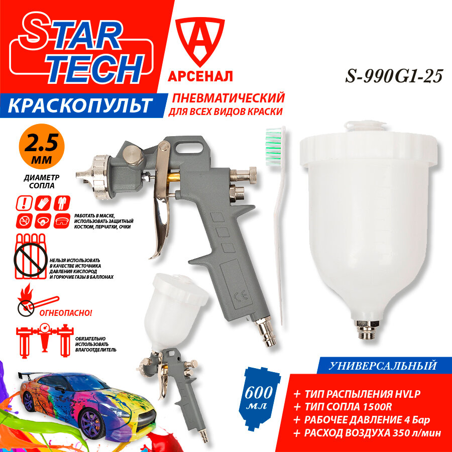 Краскопульт пневматический StarTech (сопло 2,5 мм) верхний пласт. бачок 600 мл, S-990G1-25 интересное: