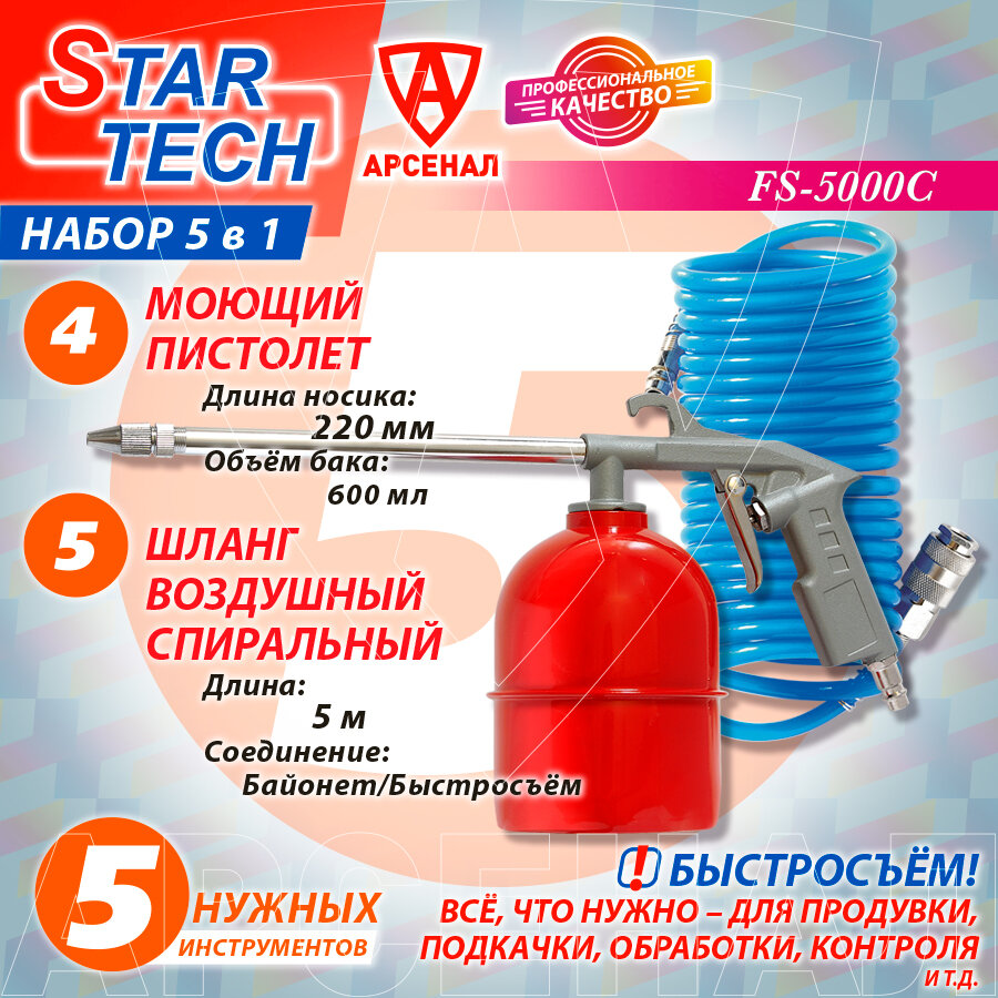 Набор пневмо инстр-та StarTech 5 предм. (мовильн, продув, подкач, краскопульт, шланг), FS-5000C интересное: