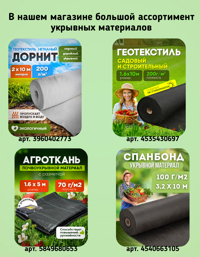 | Назначение | для защиты от морозов, для защиты от сорняков, для парников, для теплиц, для укрытия растений |