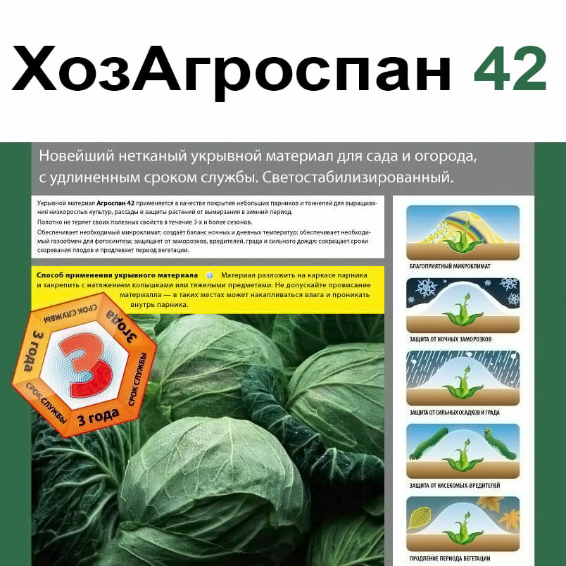 | Дополнительная информация | не гниет; пропускает солнечный свет; пропускает влагу; защищает от перепадов ночных и дневных температур; обеспечивает воздухообмен; легкое полотно; возможность повторного применения; способ применения: материал раскладывают на каркасе парника и закрепляют с натяжением колышками или тяжелыми предметами,следует не допускать провисание материала, т.к. в таких местах накапливается влага и проникает внутрь парника |