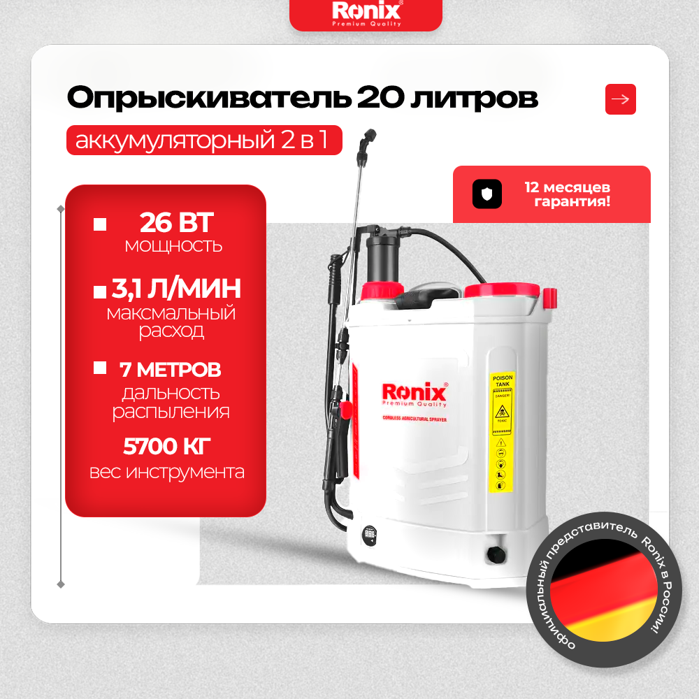 Аккумуляторный опрыскиватель 2 в 1 Ronix 20 литров ранцевый 12 В/8 Ач расход 3,1 Л/мин длина шланга 120см интересное: