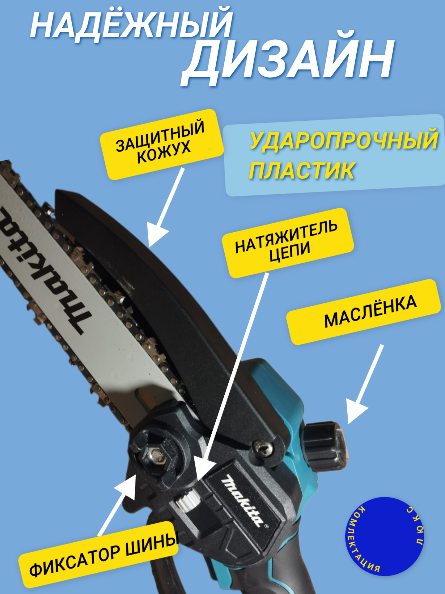 | Особенности конструкции | антивибрационная система, бесключевая замена оснастки, блокировка кнопки включения, мини-пила, прорезиненная рукоять, регулировка натяжения цепи без инструмента |