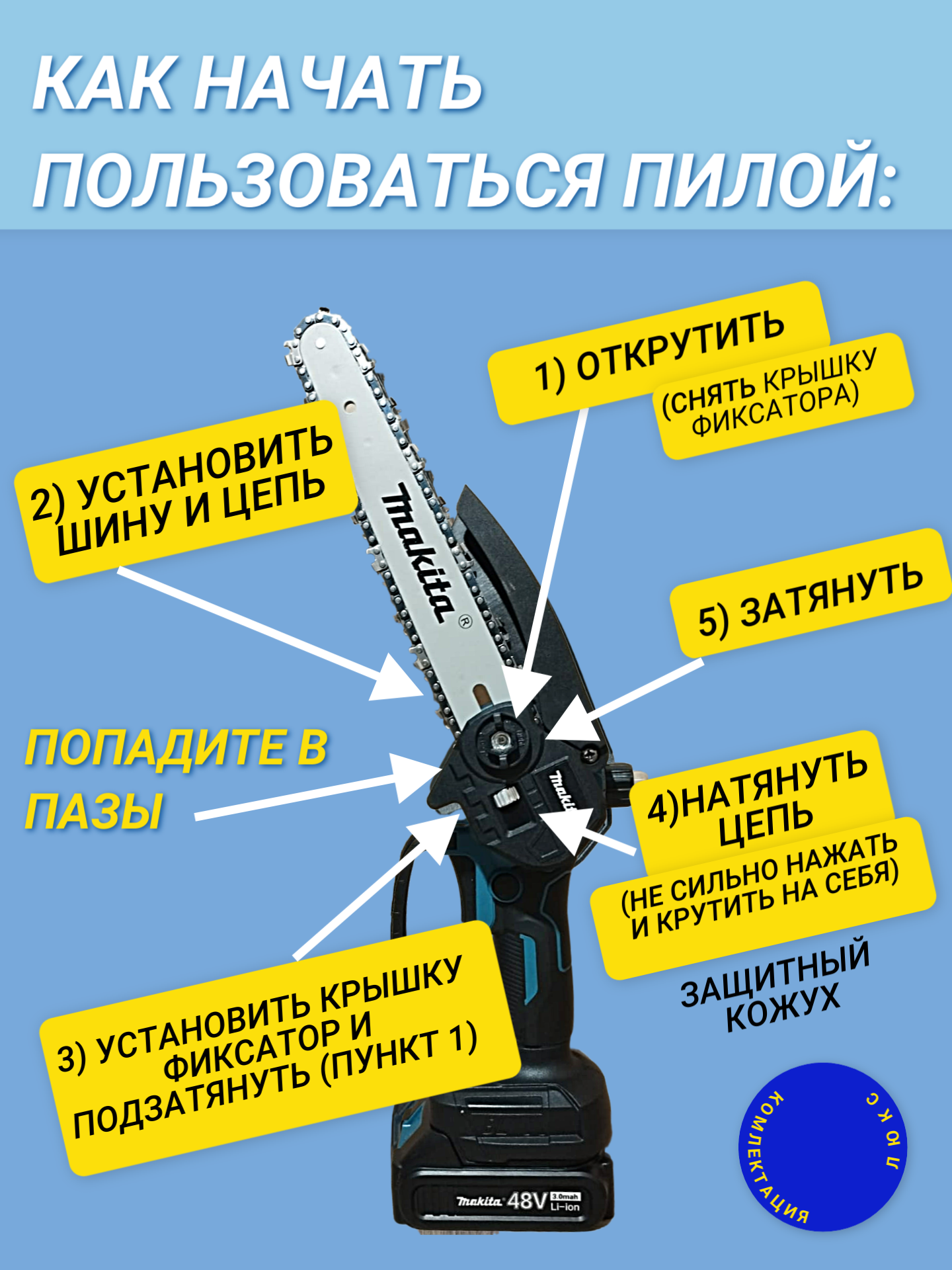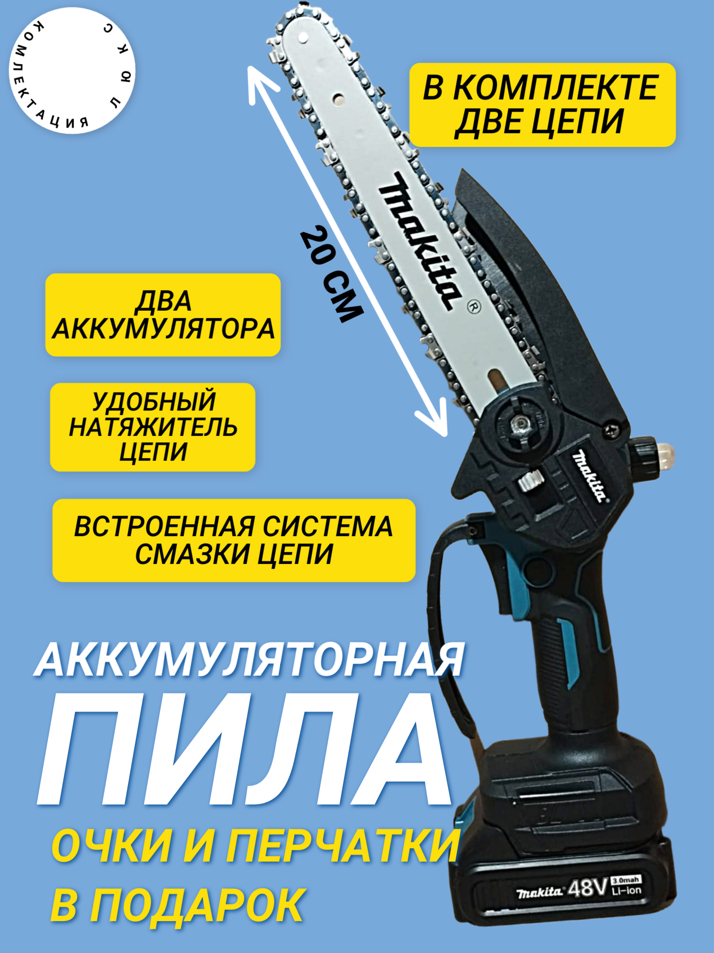 | Комплект поставки | Аккумуляторная мини-цепная пила 2) Две цепи 3) Руководство 4) Перчатки 5) 2 аккумулятор 48В 6) 1 зарядное устройство 7) Шина (полотоно) 20см |