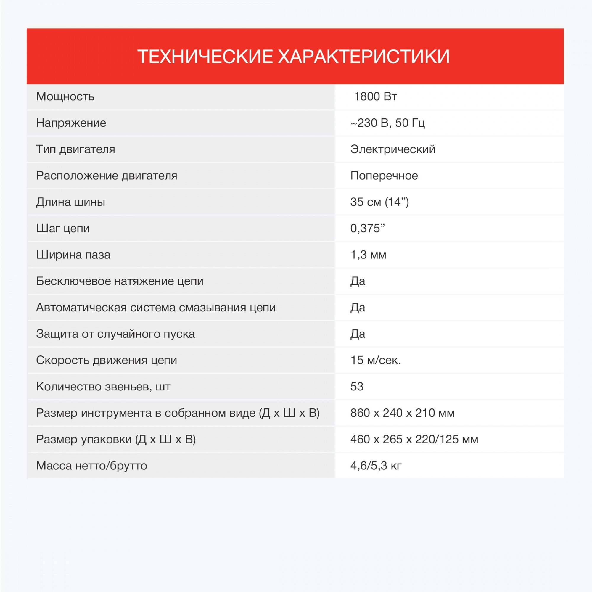 | Комплект поставки | Пила цепная электрическая, шина, кожух для шины, цепь, комплект крепежа, руководство пользователя с гарантийным талоном |