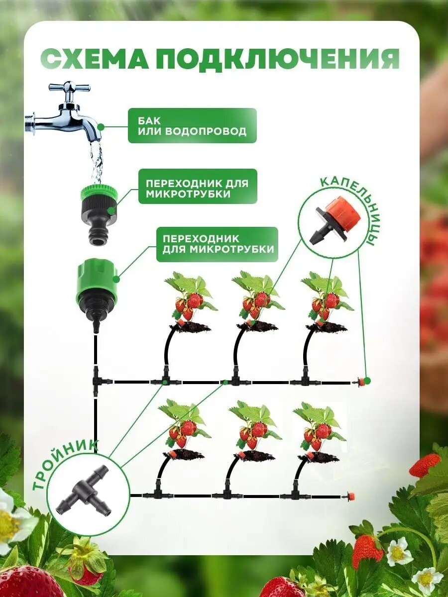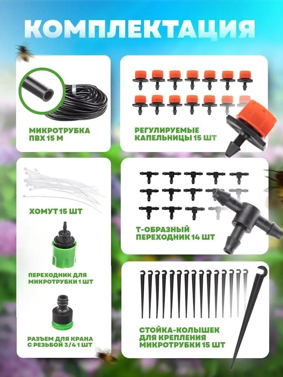 | Комплектация | Микротрубка ПВХ 15 м; регулируемые капельницы 15 шт; Т-образный переходник 15 шт; стойка-колышек для крепления микротрубки 15 шт; переходник для микротрубки 1 шт |
