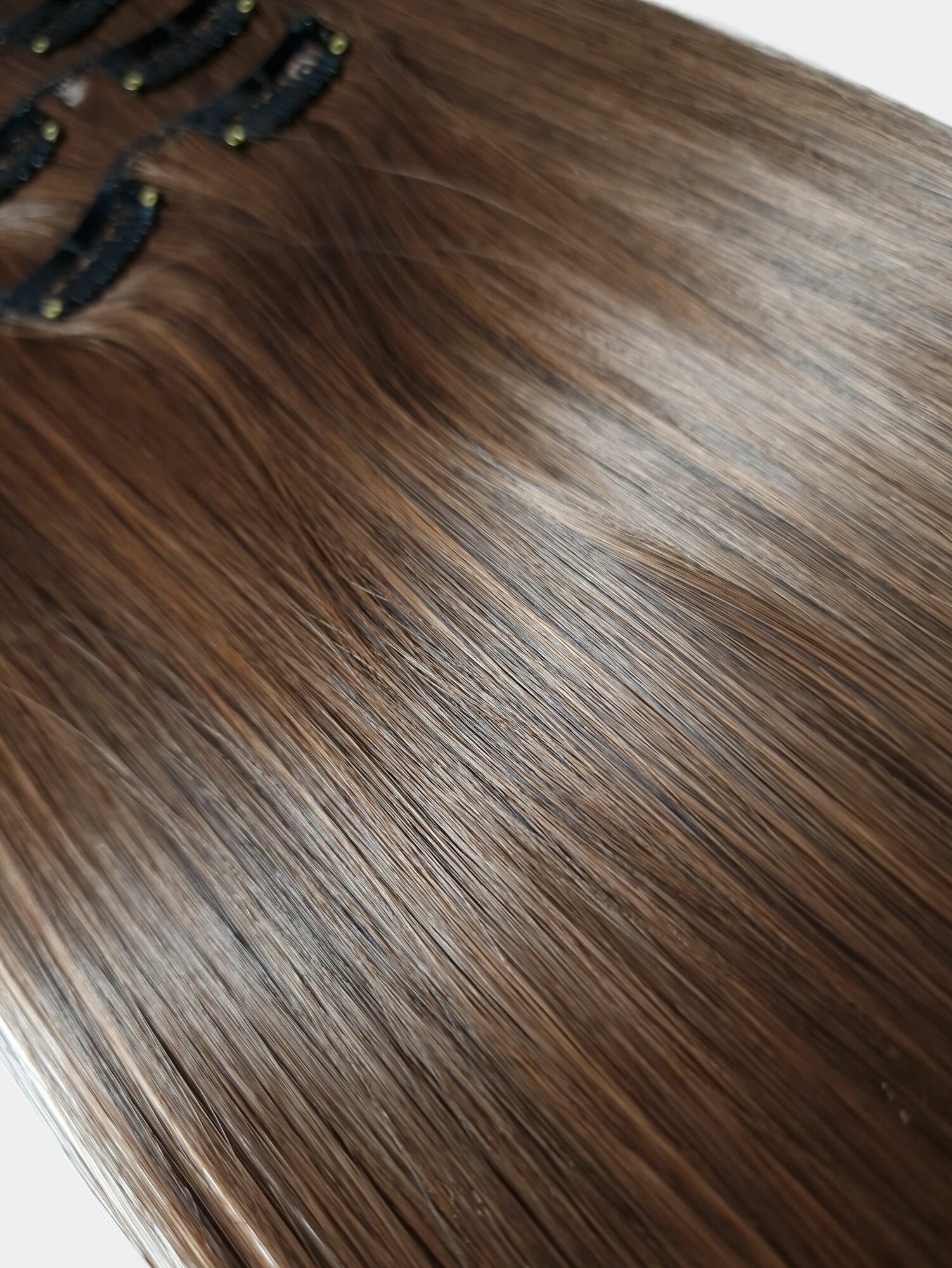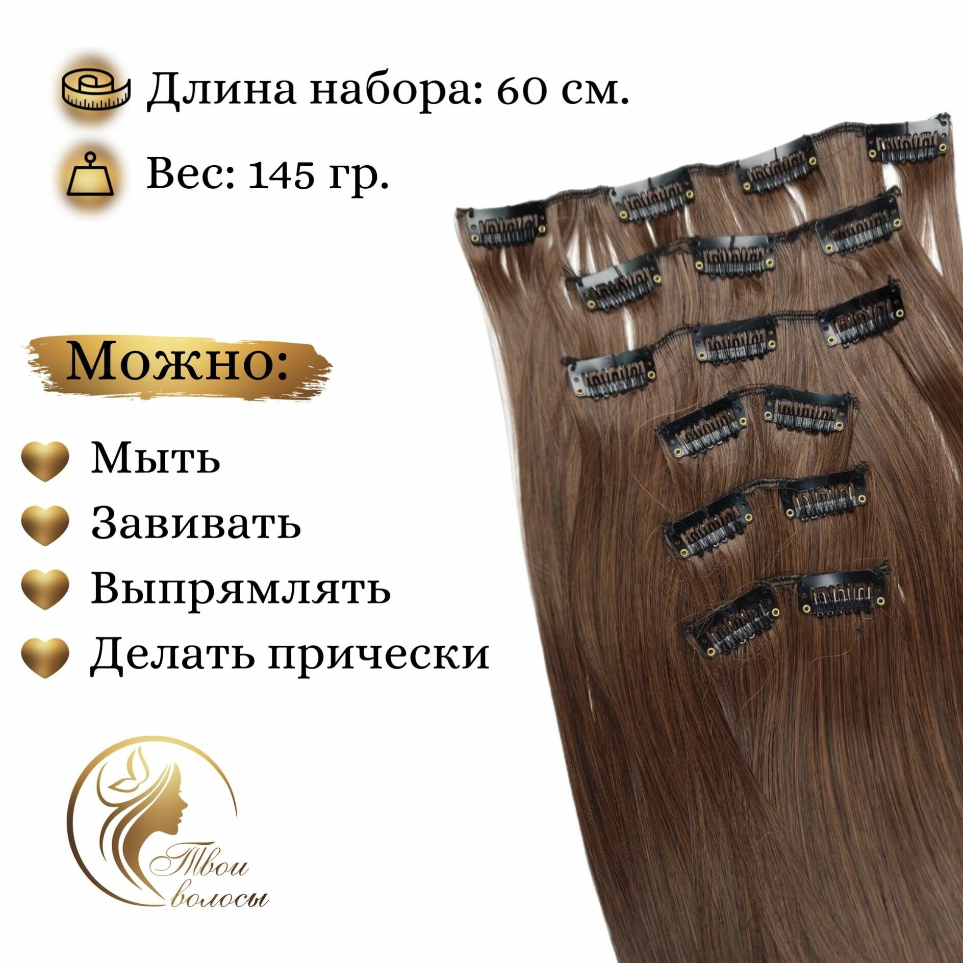 Накладные волосы, пряди на заколках-клипсах, 2/30 тёмно-русый
