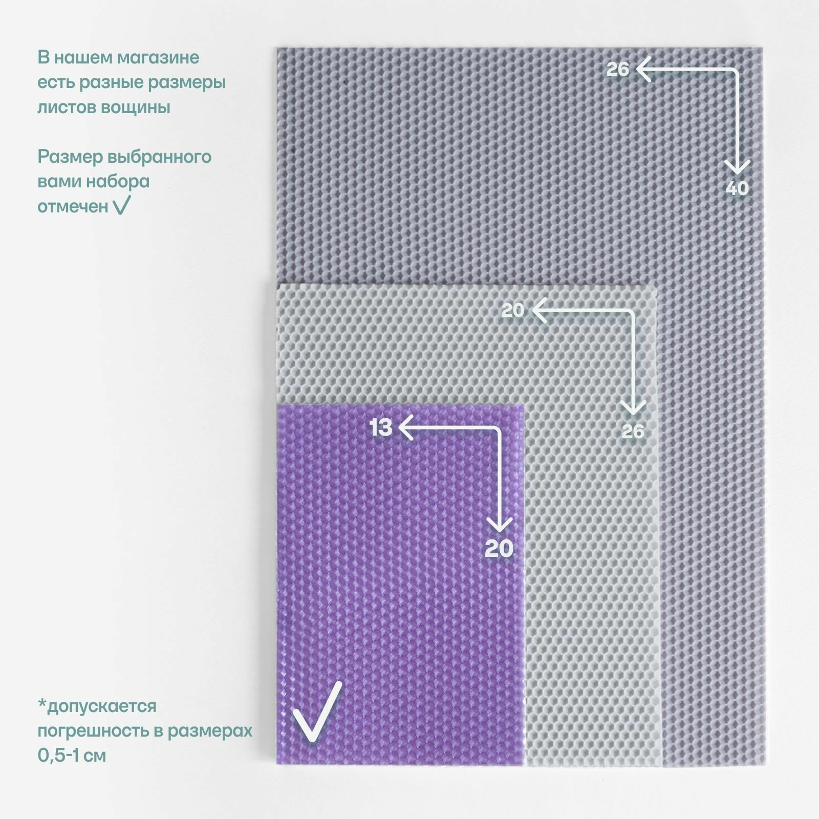 | Комплектация | - 12 листов вощины 20х13 см;- вощёный фитиль из хлопковой нити в подарок;- подробная инструкция = справится новичок и опытный мастер.Из набора можно сделать до 32 свечей. |