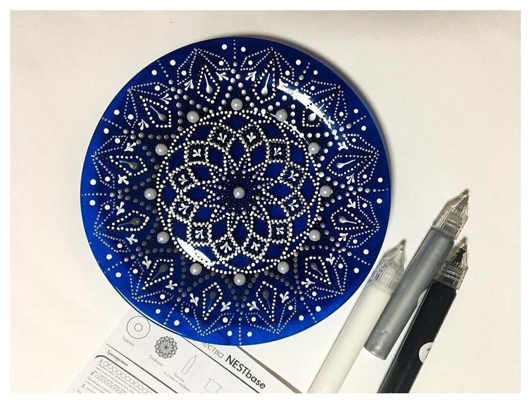 | Подробная комплектация | подробная инструкция, наклейка с изображением узора, стеклянная тарелка диаметром 205 мм, акриловые контуры по стеклу и керамике 3 шт, краска по стеклу для создания фона, губка для нанесения фона;, бусины 14 шт, клей, подставка для декоративных тарелок |