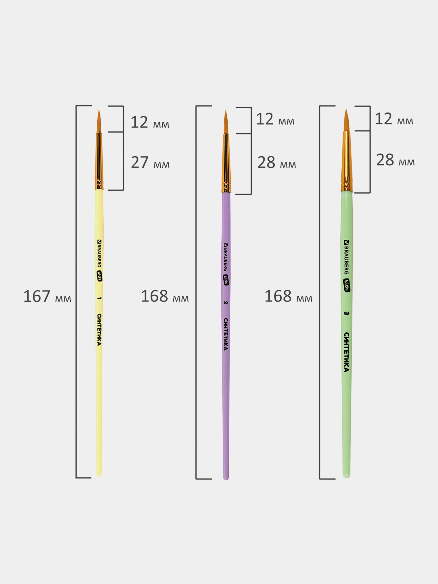 Кисти для рисования в школу набор 3 штуки, кисточки круглые № 1, 2, плоские № 3, синтетика, Brauberg Kids, 201078