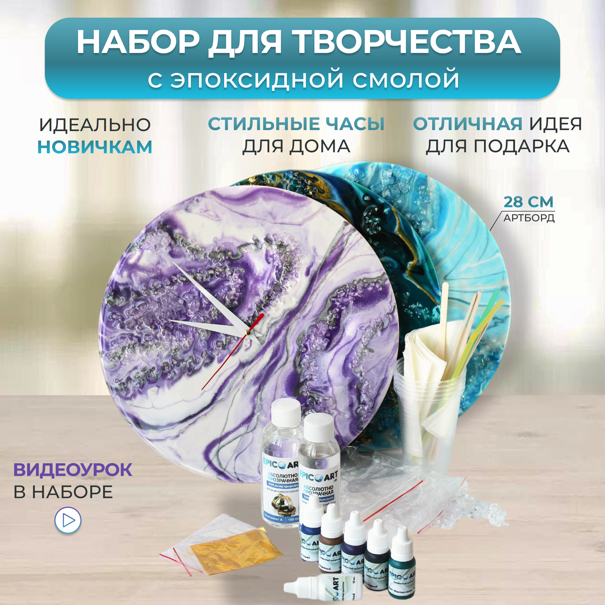| Комплектация | Комплект смолы; Артборд 1 шт; пигмент золото 1 шт, серебро 1шт; краситель 6 шт Деревянные шпатели; коктейльные трубочки; Одноразовые стаканчики; Салфетки; Клиентка для защиты стола; Видео инструкция; Общая инструкция; Перчатки 1 пара; Стеклянная крошка 2 размера; Часовой механизм; Комплект стрелок. |