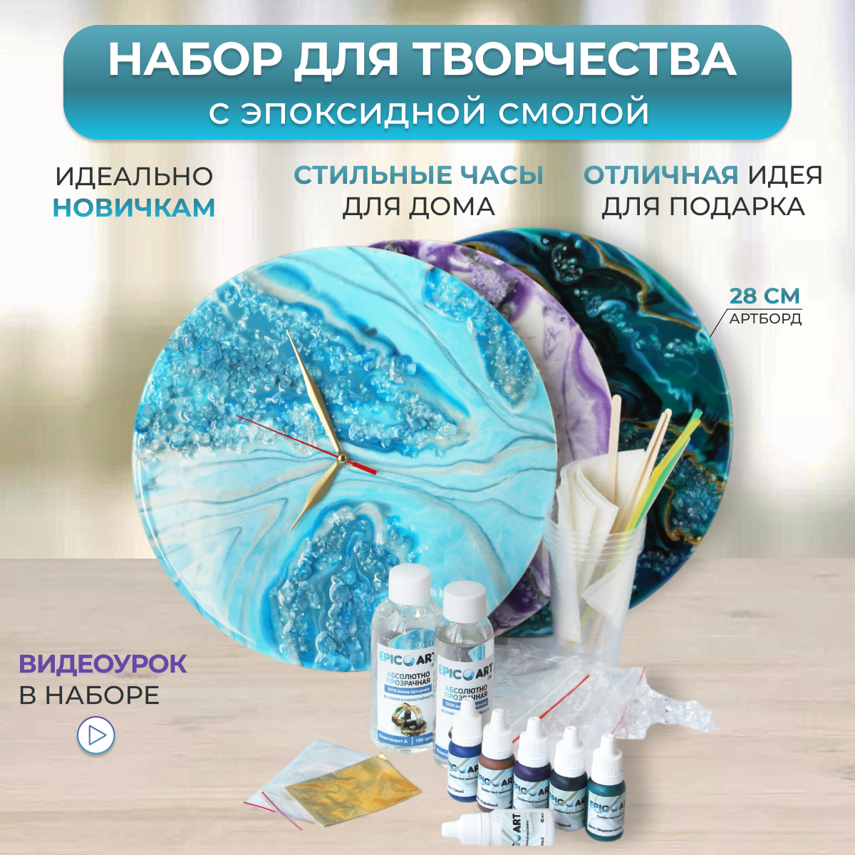 | Комплектация | Комплект смолы; Артборд 1 шт; пигмент золото 1 шт, серебро 1шт; краситель 6 шт Деревянные шпатели; коктейльные трубочки; Одноразовые стаканчики; Салфетки; Клиентка для защиты стола; Видео инструкция; Общая инструкция; Перчатки 1 пара; Стеклянная крошка 2 размера; Часовой механизм; Комплект стрелок. |