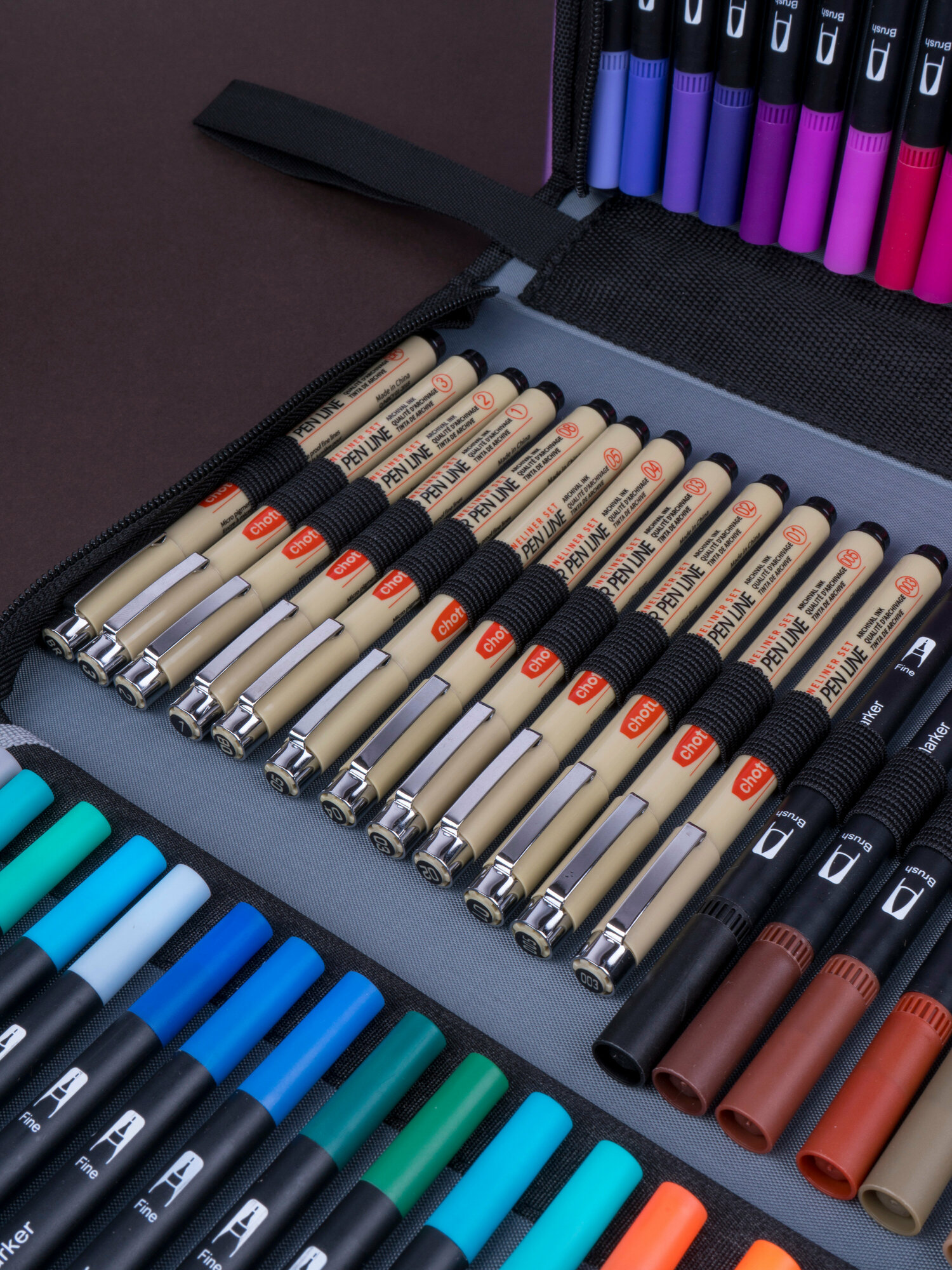 | Комплектация | 12 двухсторонних фломастеров-линеров; 6 черных линеров разной толщины; 3 угольных карандаша; 2 белых карандаша; 1 удлинитель для карандаша; 1 канцелярский нож; вечный карандаш и грифели; 14 простых карандашей; 1 клячка; 1 ластик; |