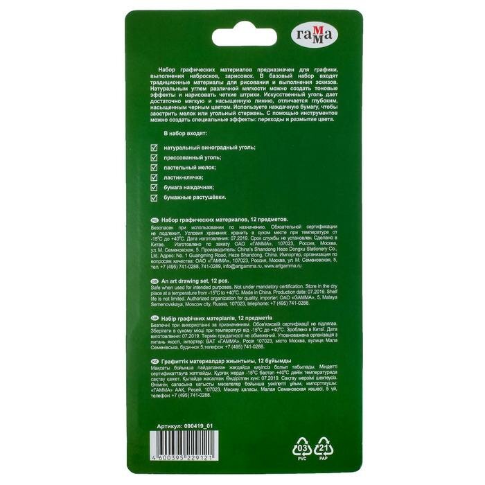 | Комплектация | - виноградный уголь различной мягкости (3 шт.); - искусственный уголь (3 шт.); - пастельный мелок; - бумажные растушёвки; - ластик-клячка; - наждачная бумага. |