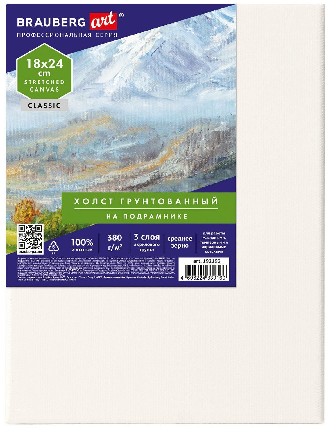 Купить Холст на подрамнике BRAUBERG ART CLASSIC, 18х24 см, 380 г/м2, грунтованный, 100% хлопок, 192193 (192193)