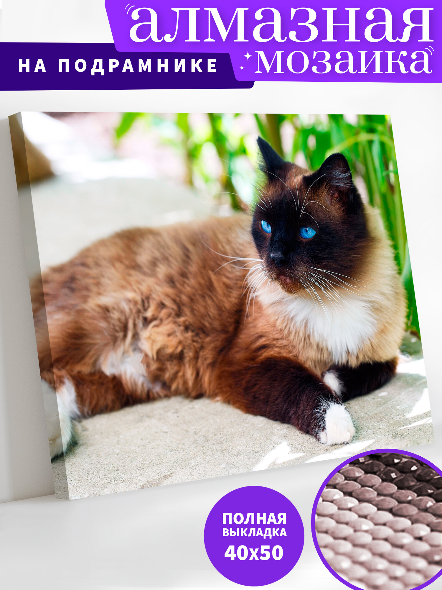Купить Алмазная мозаика кот холст на подрамнике 40х50 см "Сиамская кошка". Алмазная вышивка. Картина стразами