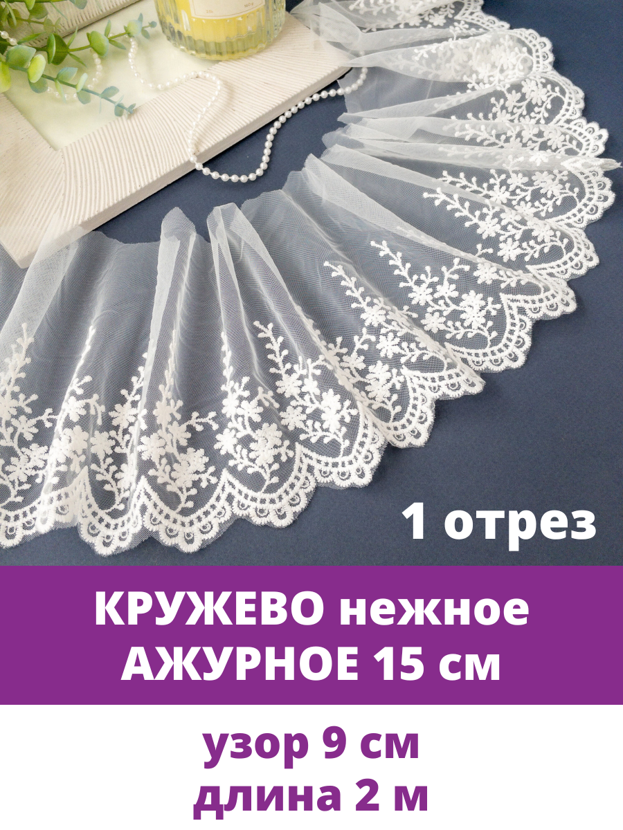 Кружево, для рукоделия и шитья, белое ажурное, ширина тесьмы 15,7 см, отрез 2 м