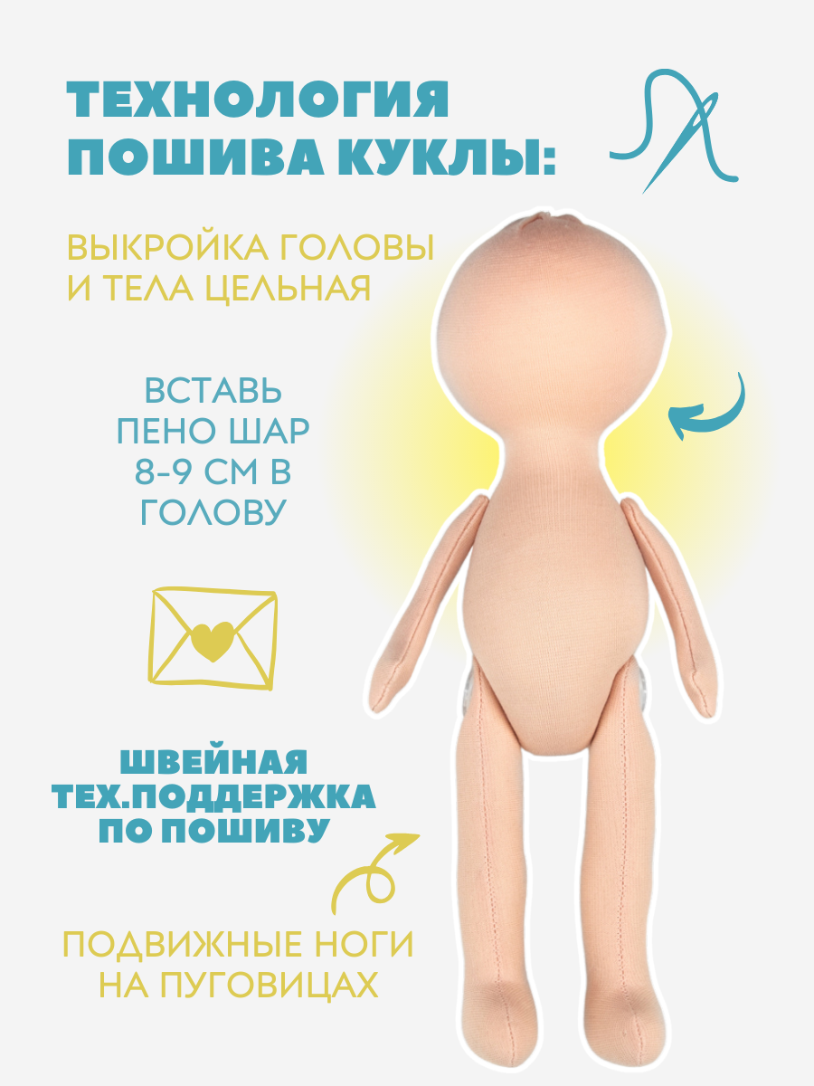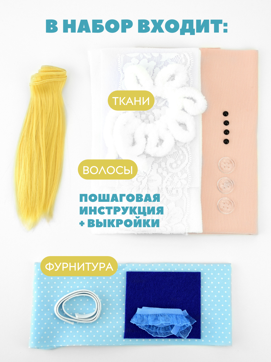 | Комплектация | трикотаж для тела куклы, ткани для одежды и обуви, выкройки куклы и одежды, пошаговая инструкция с фото, волосы трессы 50 см, глазки, пуговицы, аксессуары |