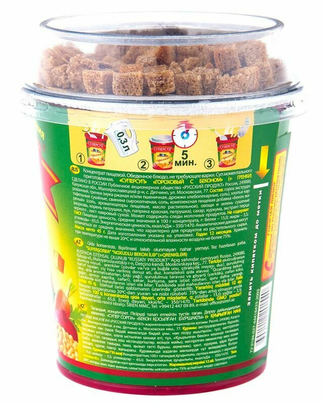 | Состав | Горох экструдированный, гренки (мука ржаная и пшеничная, дрожжи хлебопекарные, соль), хлопья картофельные сушёные, свинина сырокопченая (свинина, соль, нитритно-посолочная смесь (соль, фиксатор окраски -нитрит натрия), сахар), соль, ароматизатор, овощи и зелень сушеные (морковь, корень петрушки, лук, паприка красная, петрушка), сахар, куркума, экстракт перца черного, лист лавровый сухой. |