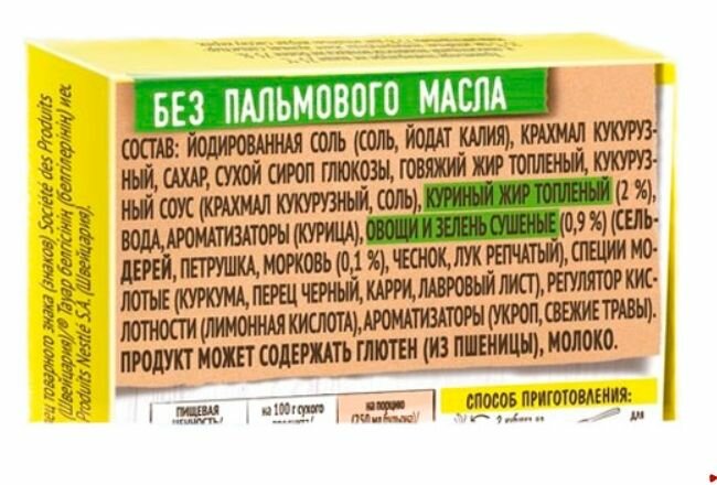 | Состав | йодированная соль (соль, йодат калия), крахмал кукурузный, сахар, сухой сироп глюкозы, говяжий жир топленый, кукурузный соус (крахмал кукурузный, соль), куриный жир топленый (2 %), вода, ароматизаторы (курица, укроп, свежие травы (содержит глютен)), овощи и зелень сушеные (0,9 %) (сельдерей, петрушка, морковь (0,1 %), чеснок, лук репчатый), специи молотые (куркума, перец черный, карри, лавровый лист), регулятор кислотности (лимонная кислота). Продукт может содержать молоко. |