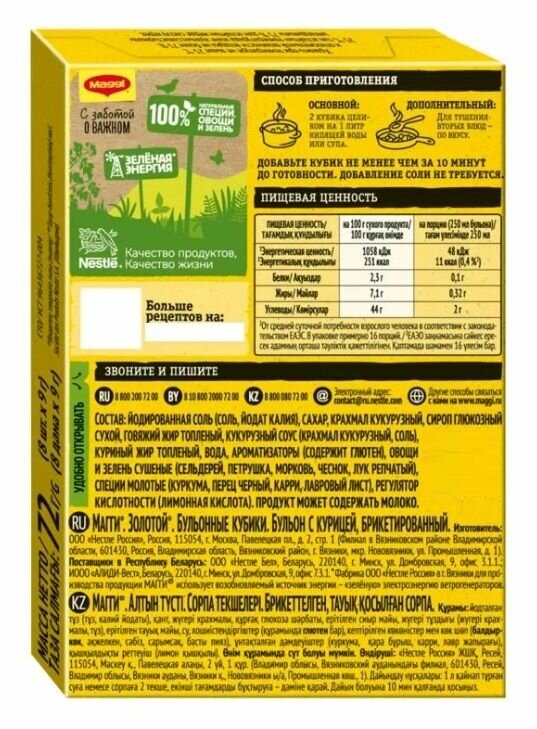 | Способ приготовления | Основной: 2 кубика целиком на 1 л кипящей воды или супа; Дополнительный: для вторых блюд -по вкусу |
