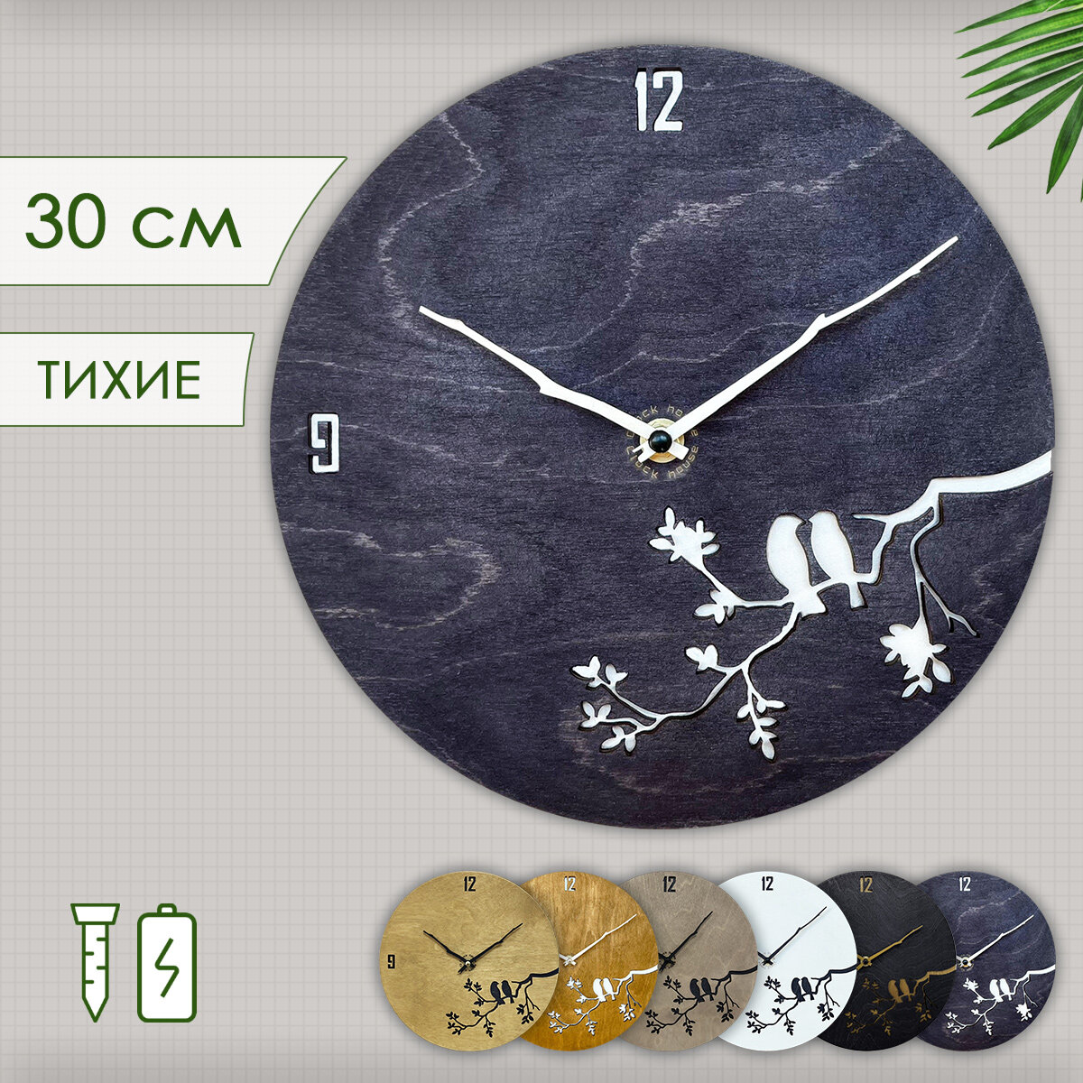 Купить Часы настенные бесшумные "Птицы на ветке", деревянные интерьерные на кухню, черные
