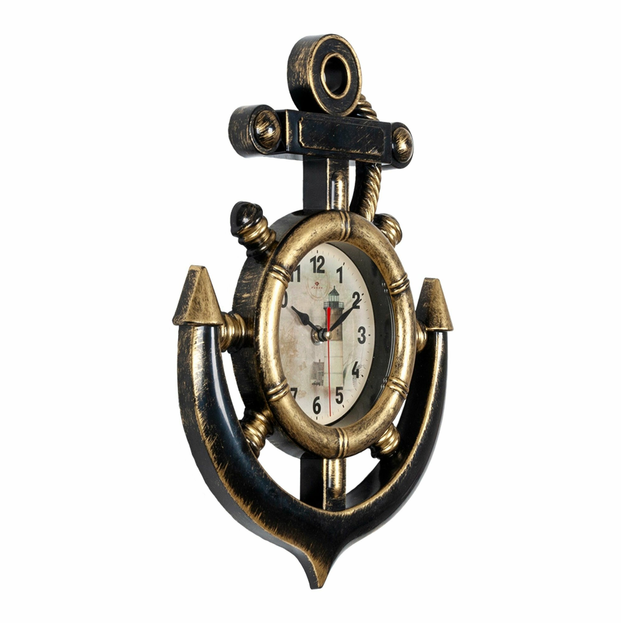 Купить Большие настенные часы с кварцевым бесшумным механизмом в виде якоря на батарейках АА Рубин Маяк 3827-002 с арабскими цифрами плавным ходом для интерьера дома спальни гостиной кухни или офиса, пластиковый корпус черно-золотистого цвета, 27.5х38 см