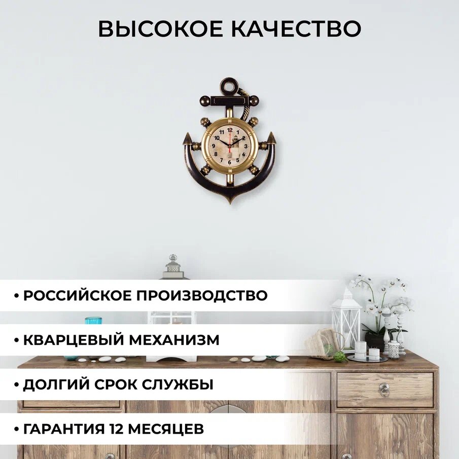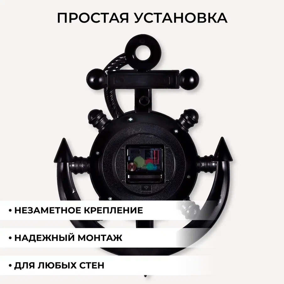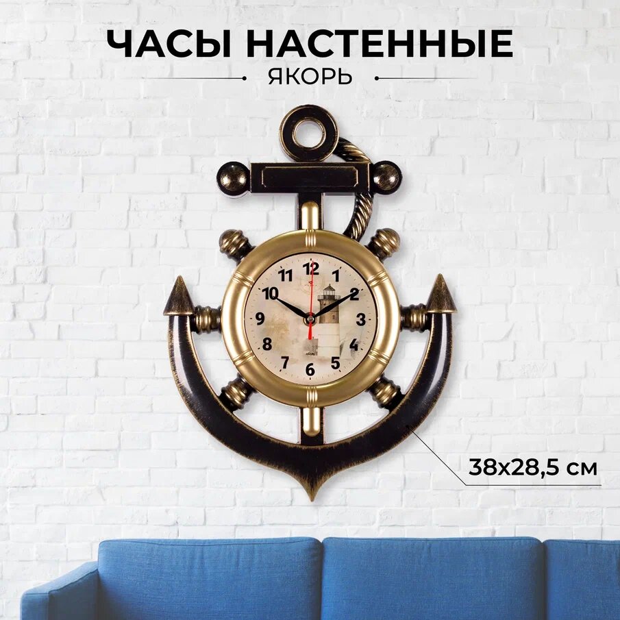 СохранитьБольшие настенные часы с кварцевым бесшумным механизмом в виде якоря на батарейках АА Рубин Маяк 3827-002 с арабскими цифрами плавным ходом для интерьера дома спальни гостиной кухни или офиса, пластиковый корпус черно-золотистого цвета, 27.5х38 см интересное: