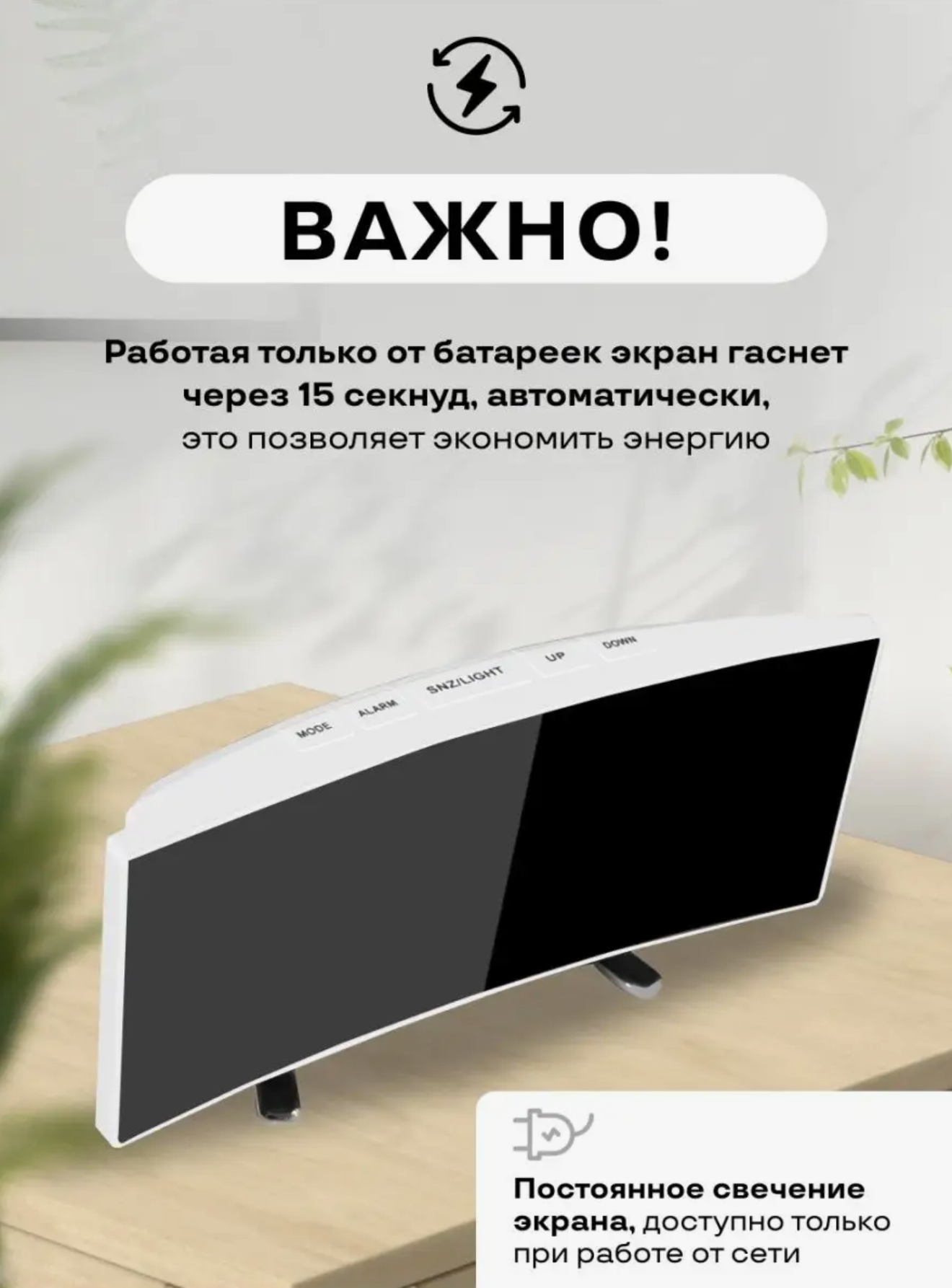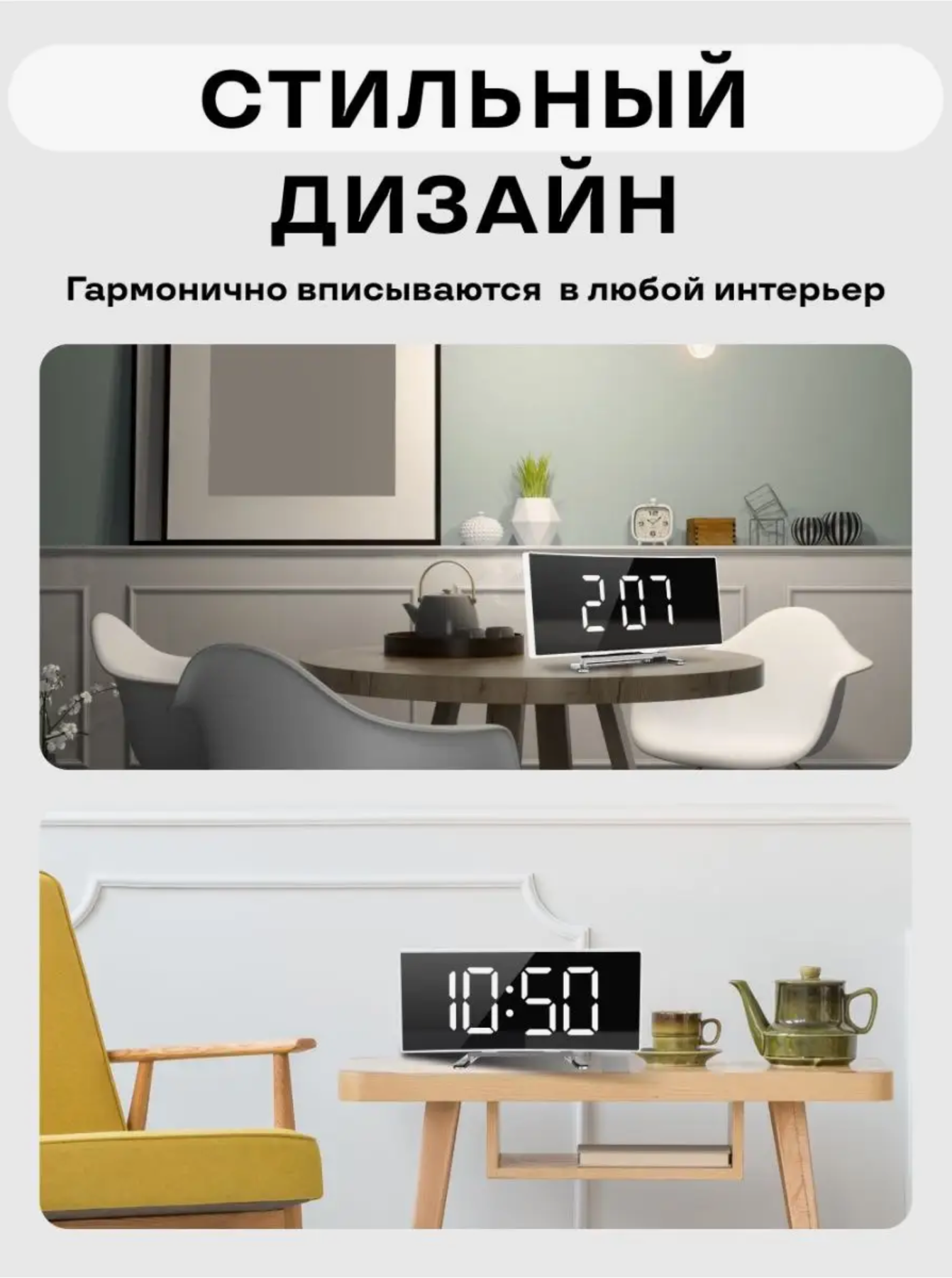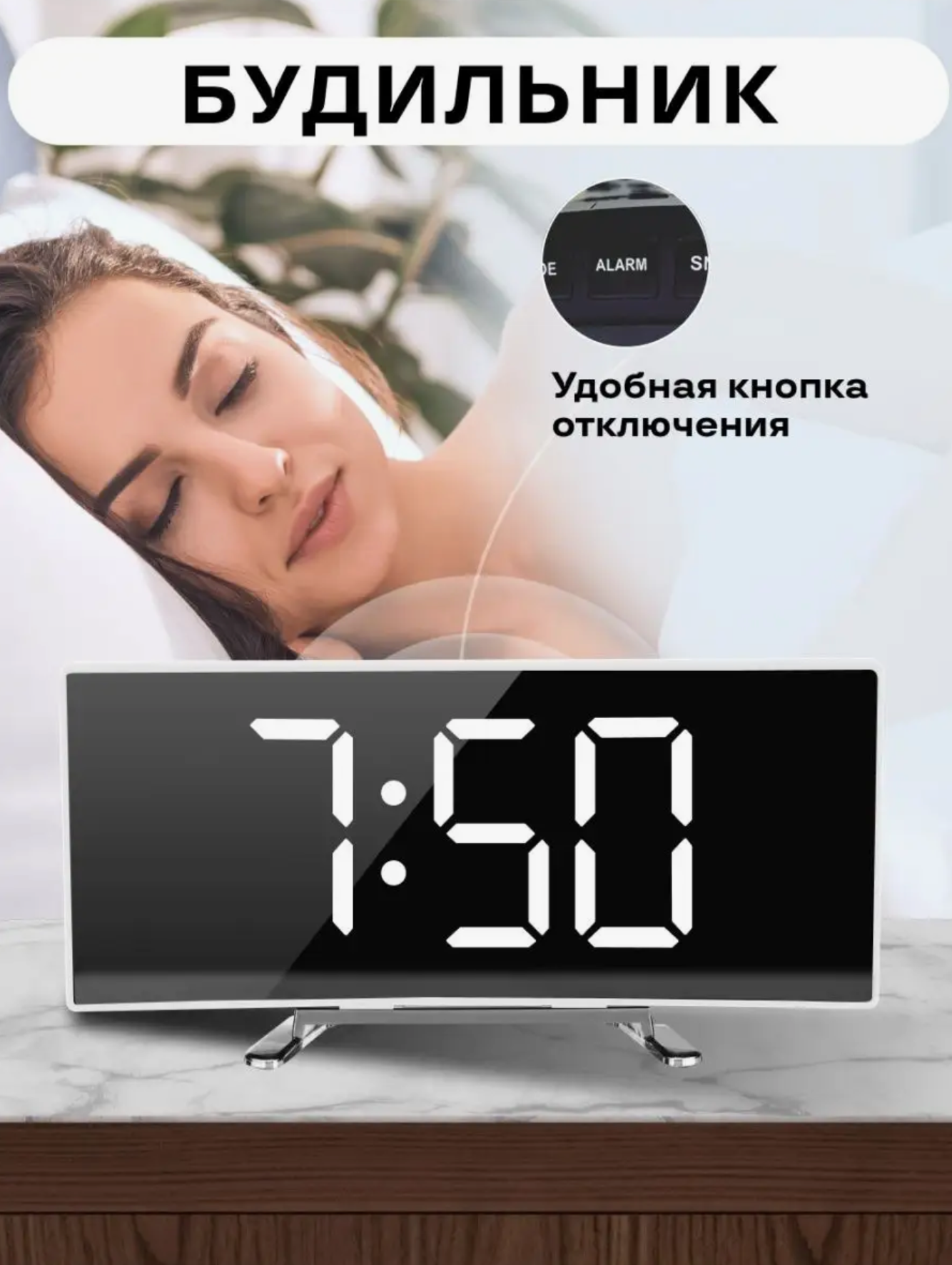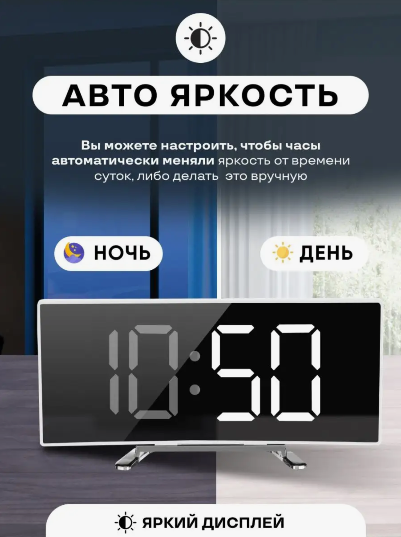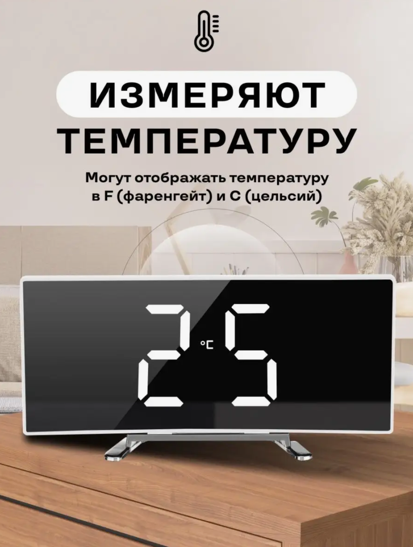 | Дополнительная информация | зеркальный светодиодный будильник, оснащен функциями автоматического измерения температуры, автоматического уменьшения яркости свечения ночью |