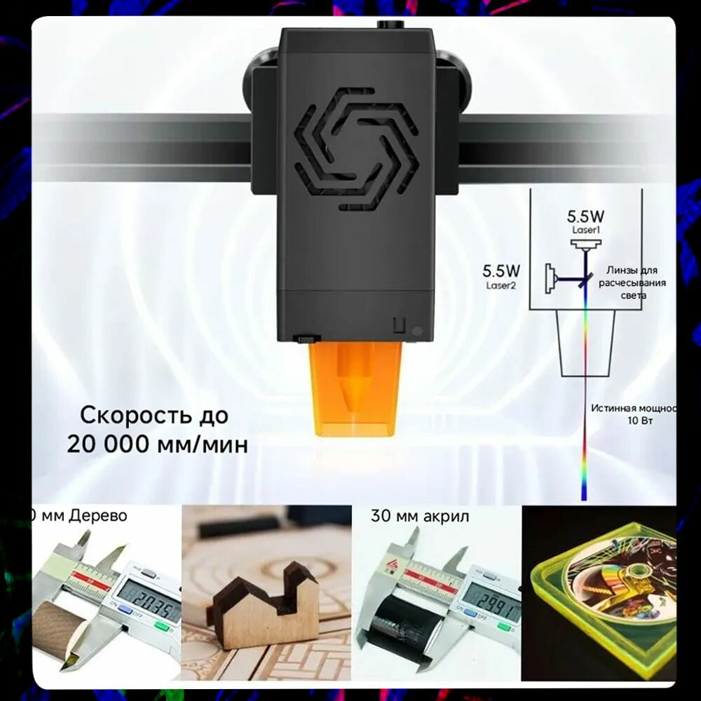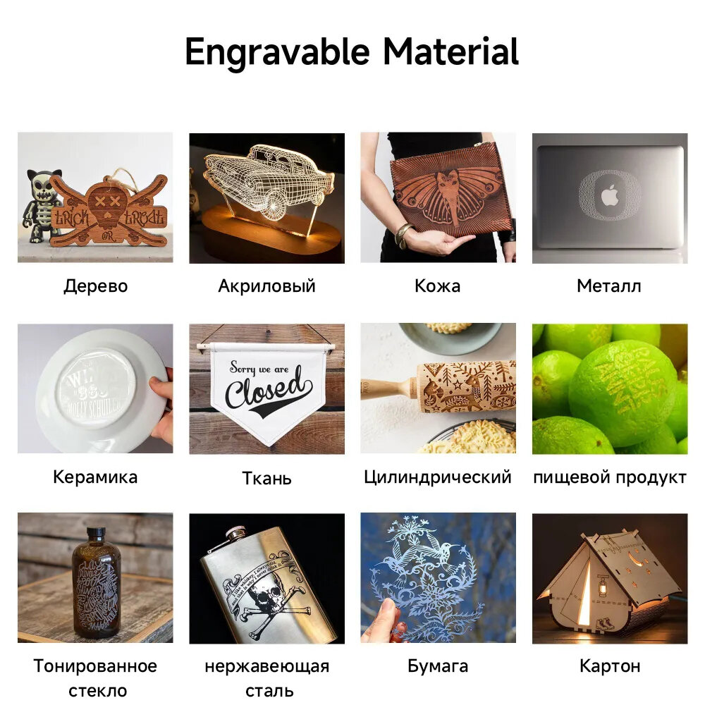 | Комплектация | Лазерный гравер, Блок питания (PSU), Сетевой кабель, USB-кабель, Защитные очки, Инструмент для фокусировки, Инструменты для сборки, Руководство по эксплуатации, Крепежные элементы, Кабельные стяжки, Антенна Wi-Fi, Образцы материалов |
