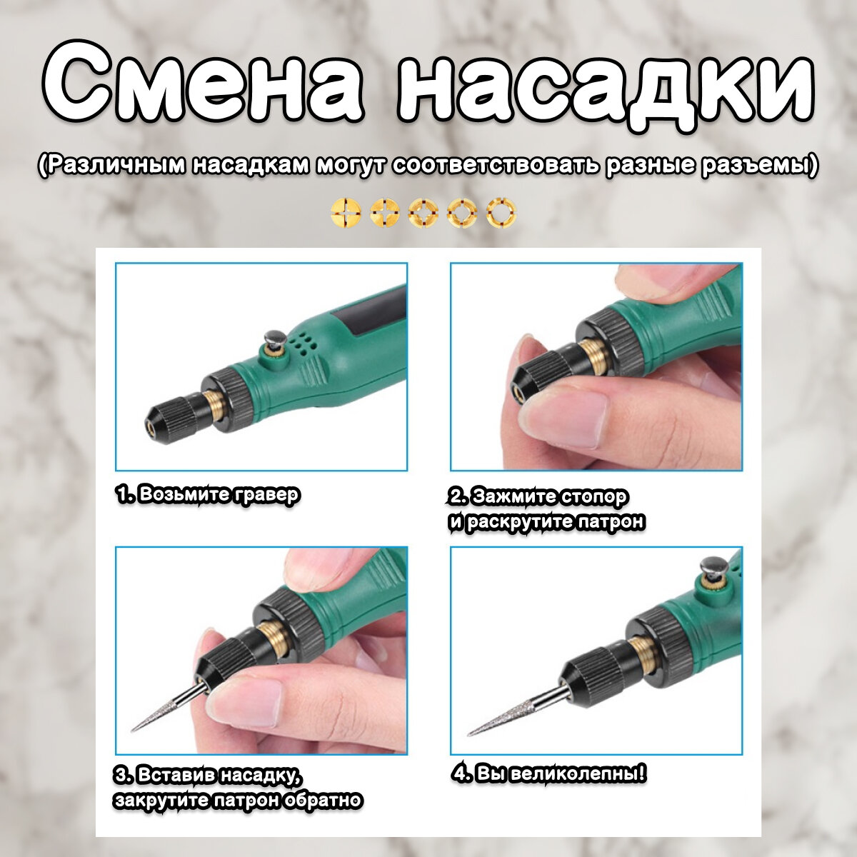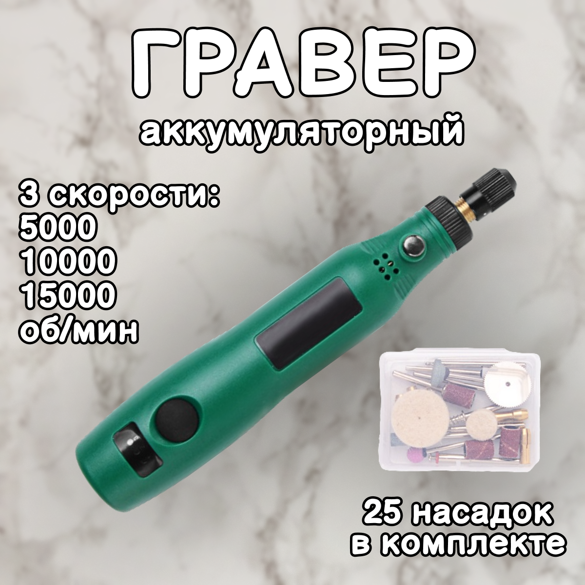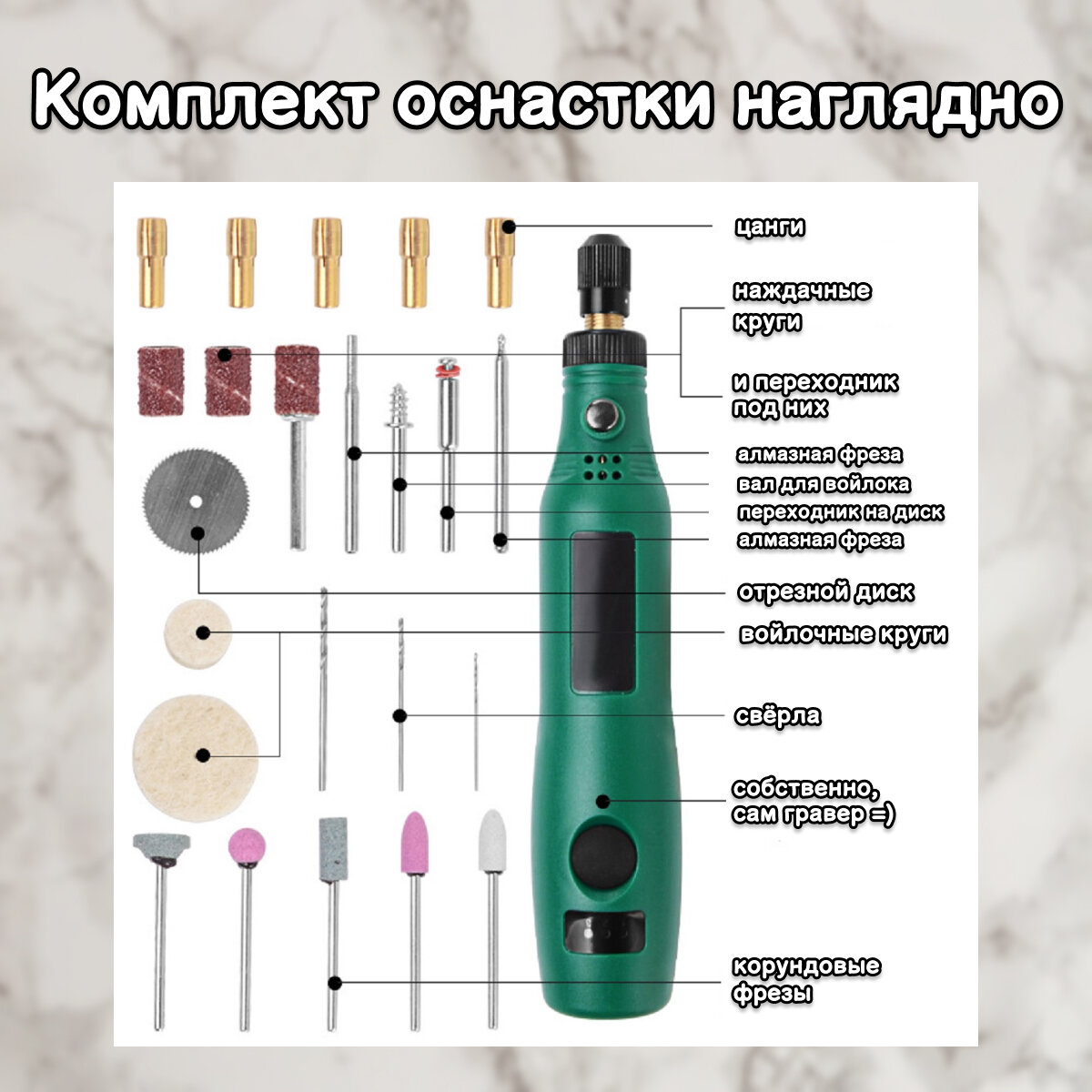 | Комплектация | Гравер, набор оснастки 25 предметов, USB кабель для зарядки. |